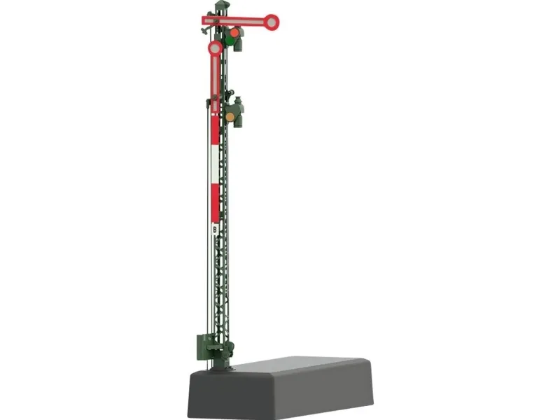 The signal has 2 independent semaphores and an open lattice mast. The signal changes from red to green or red to green/yellow.