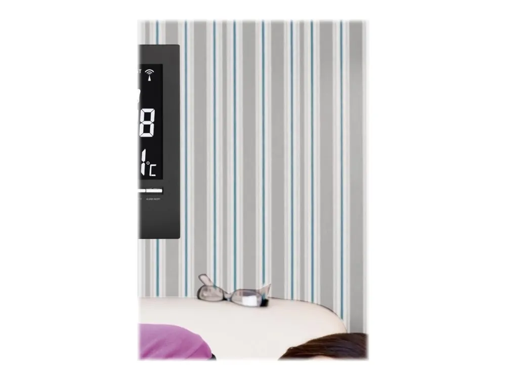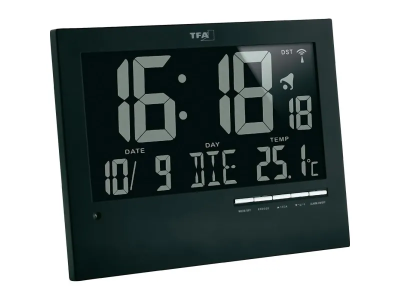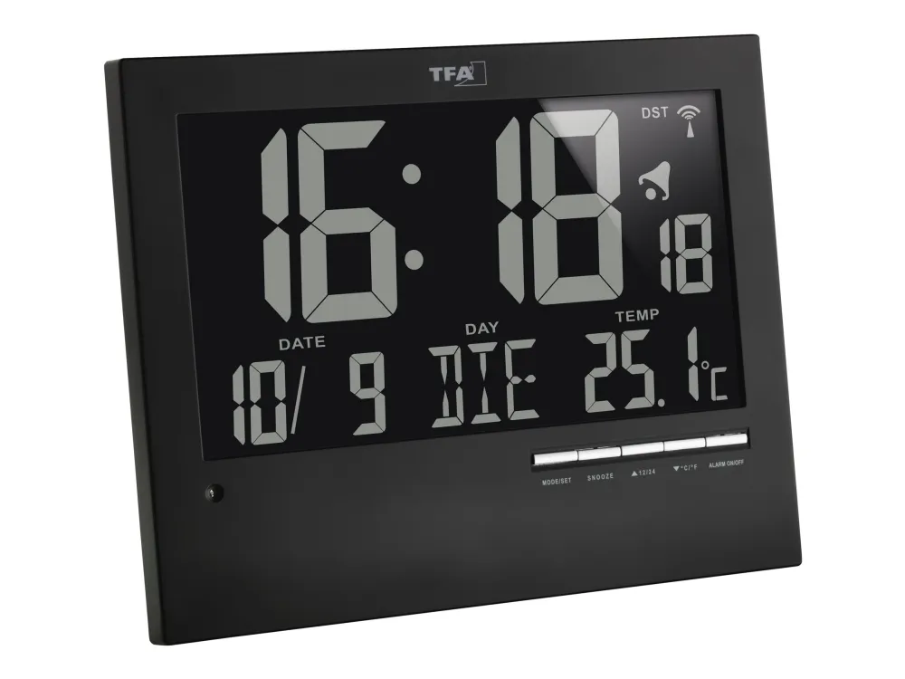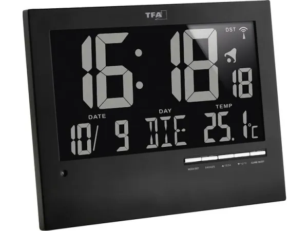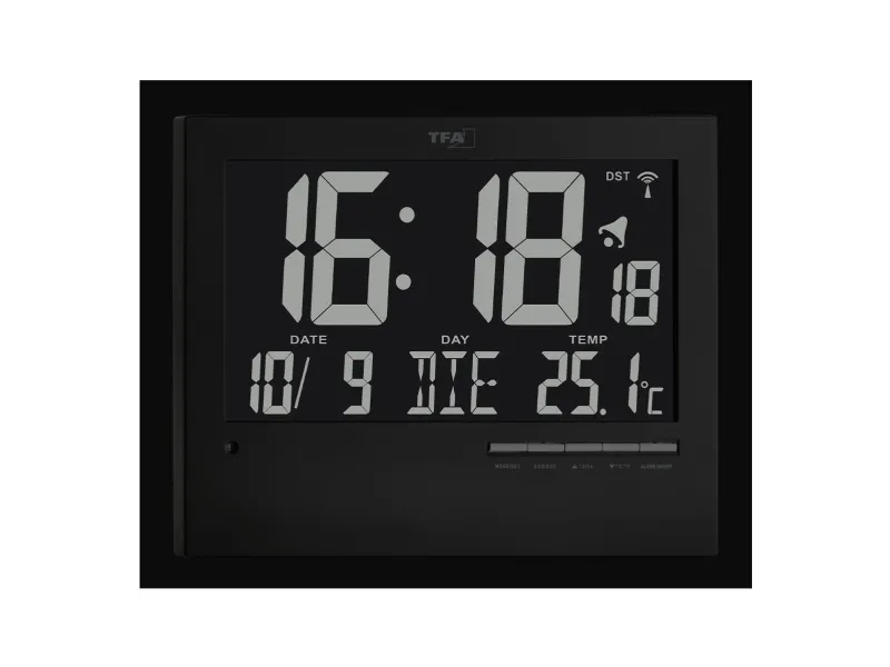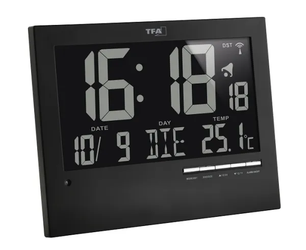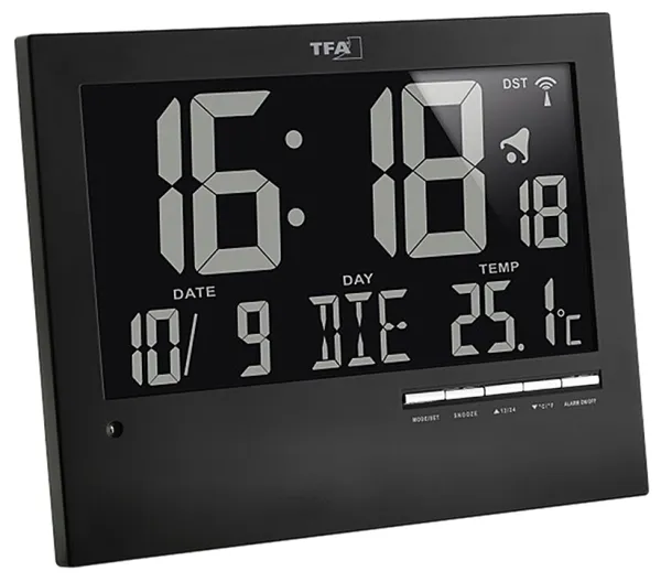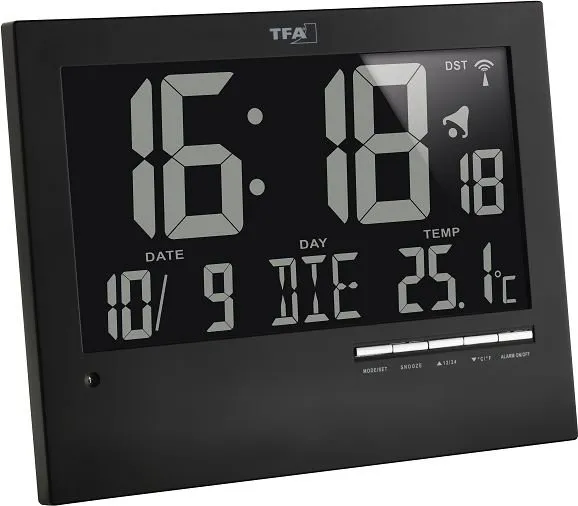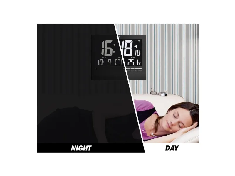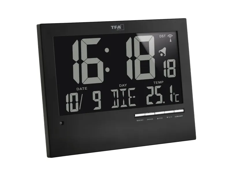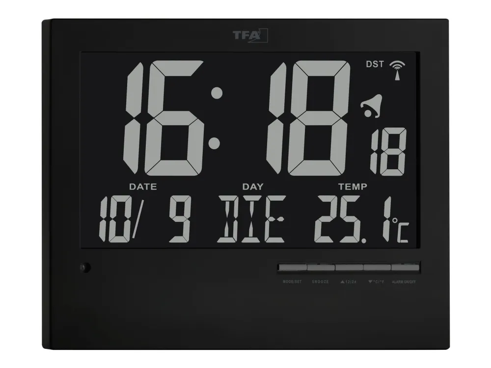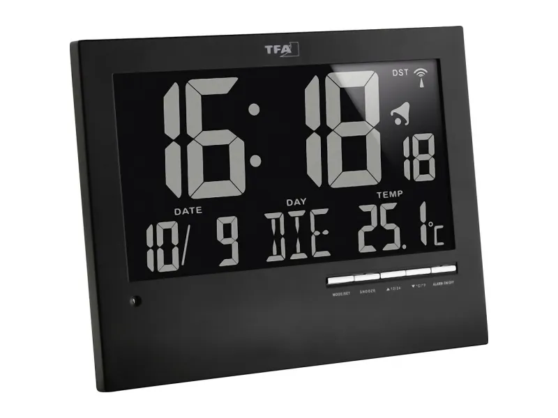 Indication of indoor temperature, date and day-of-the-week, alarm with snooze function, automatic night lighting adjustable, bright backlight by pressing a key or permanent using a power adaptor (optional)