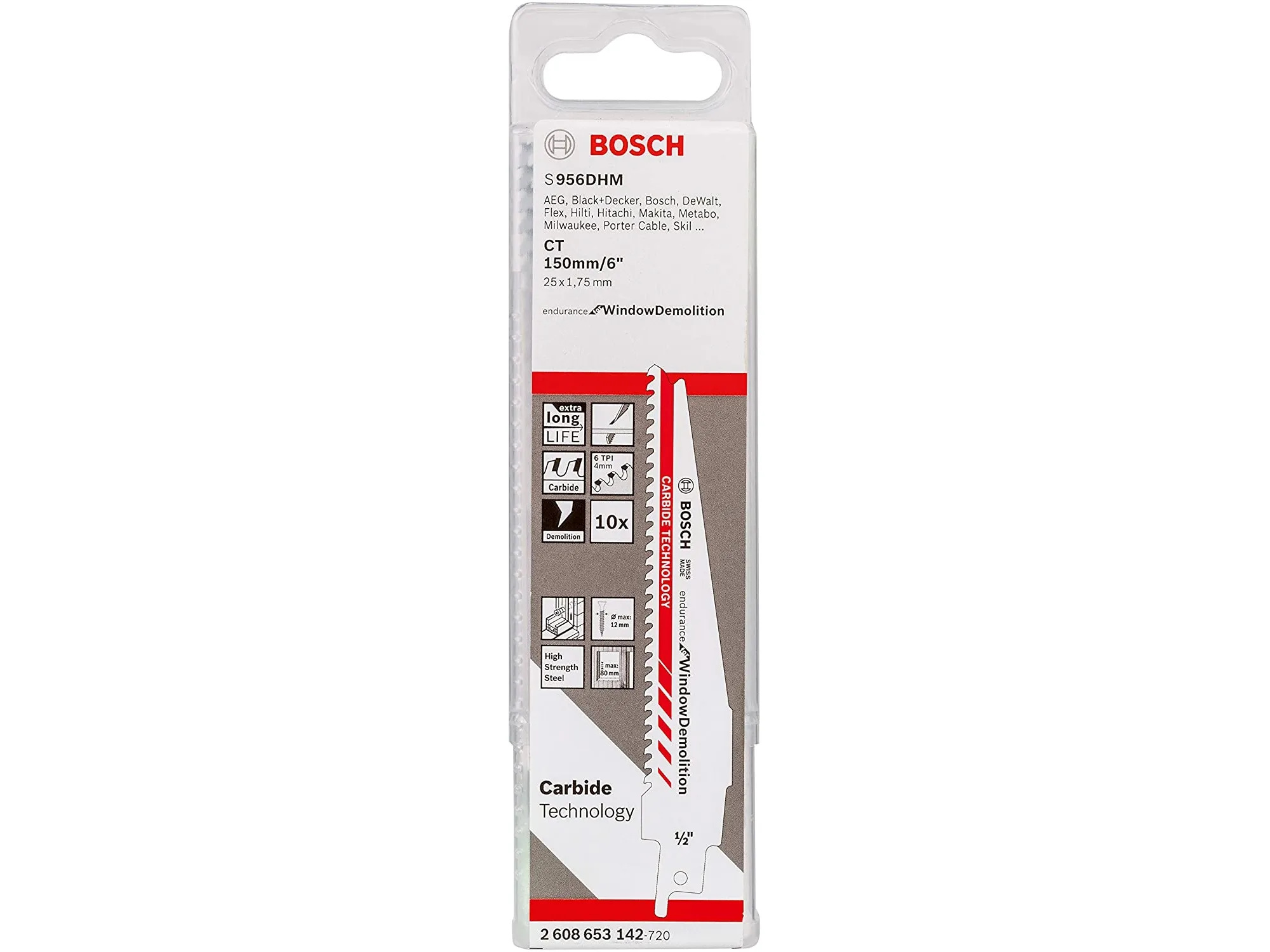 The Bosch S 956 DHM Endurance for Window Demolition saber saw blade offers excellent blade life for fast cuts in wood and metal. The ground carbide teeth are designed for maximum resilience and quick results when dismantling wooden and plastic windows. The blade's tapered body allows for easy access to hard-to-reach areas, while the relief-ground first tooth tip also allows for plunge cuts. The teeth have been welded to the steel body using Carbide Technology, which enables particularly fast cutting. The blade withstands use in the toughest applications, eg with high-strength window construction screws. The 4mm tooth pitch cuts windows of all sizes. The S 956 DHM Endurance for Window Demolition is suitable for use with saber saws with a 1/2" universal shaft mount.