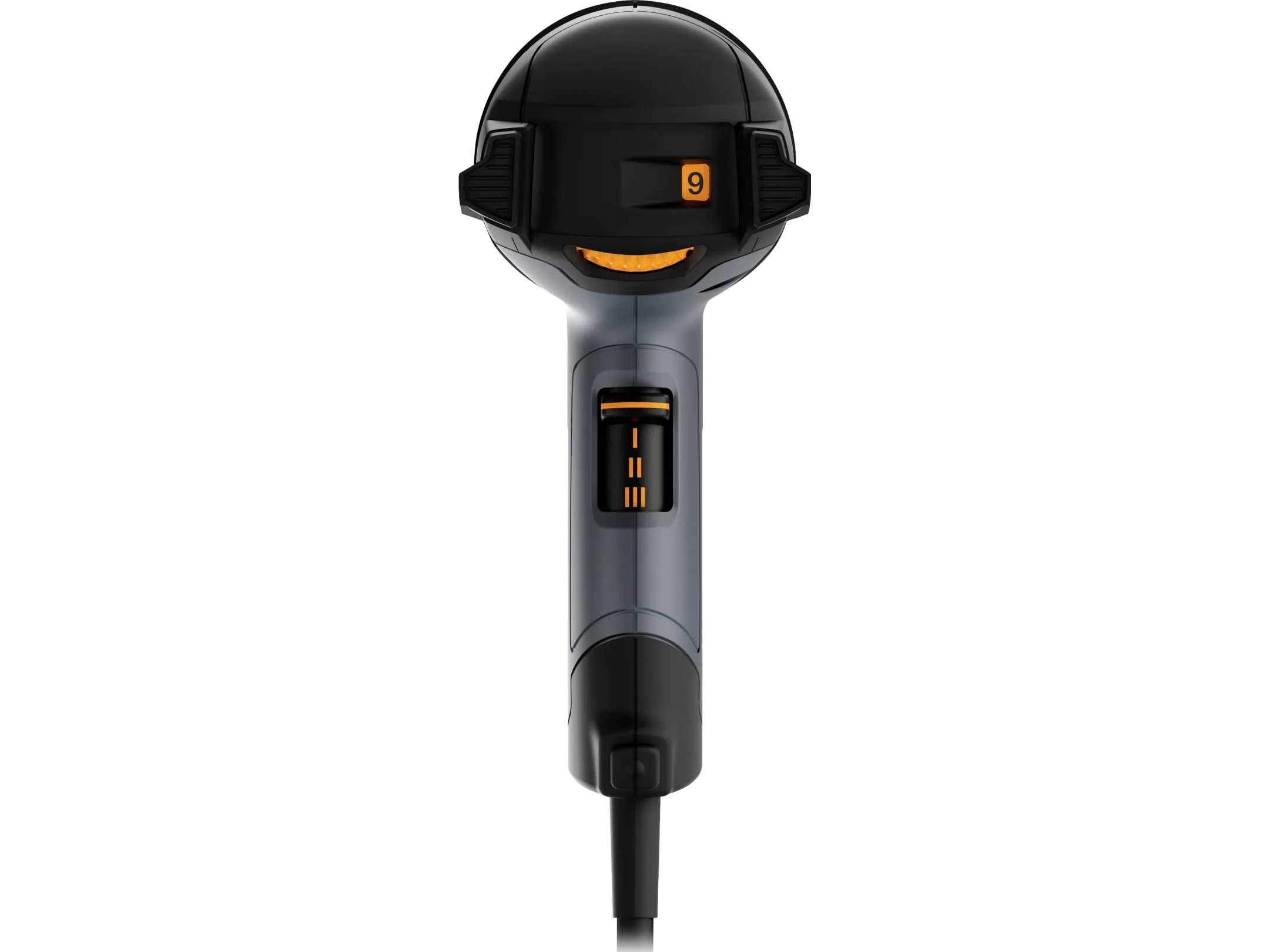 Welcome to the professional class! The 2200-W HG 2120 E hot air tool in Carwrapper Edition. Fitted with a 7.5 m cable, it is particularly suitable for car wrapping.\nThe longer cable provides a particularly wide action radius for wrapping work on large areas. The ceramic heaters temperature can be infinitely varied over a range of 80 °C - 630 °C at the thumbwheel. Airflow can be controlled in 3 stages – from 150 – 500 l/min. The practical powerhouse weighs only 840 g (without mains cable) – ideal for fatigue-free working.\n\nFeatures\n: 2200-watt brushless motor, rated for 750 hours of operation. Integrated thermal cut-out to prevent overheating. 3-stage blower, from 150 – 500 l/min. Simple temperature adjustment from 80 – 630 °C by thumbwheel, temperate display on the thumbwheel in in 9 stages. Ergonomic handle with soft inlay for working safely with one hand. Non-slip standing surface and hanger.\n\nService-friendly\n: the heater can be replaced in next to no time, the power cord can be changed without opening the enclosure.\n\nAccessories\n: the HL Scan temperature scanner indicates the correct temperature while tamping the foil. The optional fine dust filter provides additional protection in dusty environments.