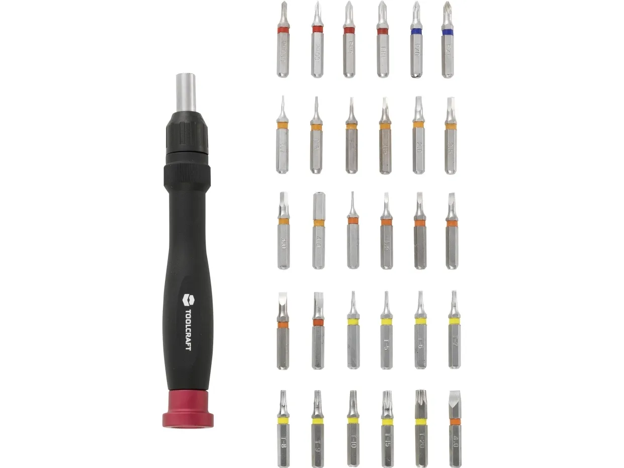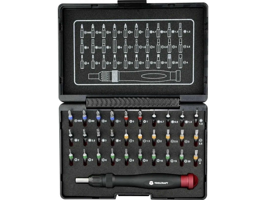 31 dele Micro-bit-sæt inkl. med skraldefunktion Højre- / venstredrejning · Trinløs skraldefunktion. Perfekt til alle fagfolk inden for finmekanik, elektronik, smykkefremstilling, optik. Alle dele er vibrationssikkert indlejret i hårdt skum og overskueligt arrangeret i opbevaringsboksen. Farvekodede S2-bits Aluminium-håndholder med skraldefunktion Overskuelig, slagfast opbevaringsæske