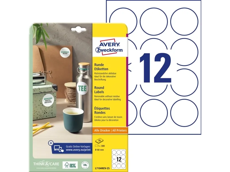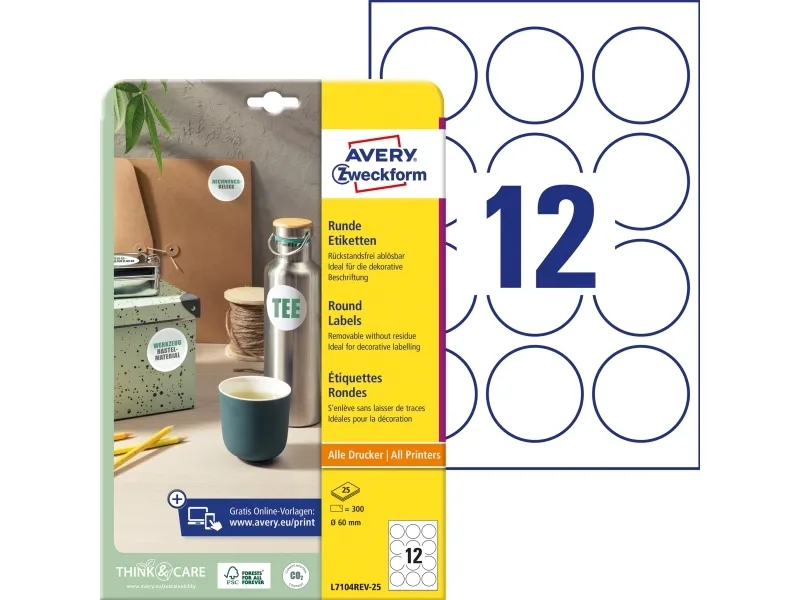 Klistermärken, prismärken, tillfälliga anteckningar och markeringar – ibland är det praktiskt att kunna ta bort etiketter från varor, mappar eller liknande utan besvär och kvarvarande limrester. Med Avery L7104REV-25 avtagbara runda produktetiketter med 12 etiketter/ark och 300 etiketter/förpackning kan du enkelt märka dina produkter tillfälligt och vara säker på att etiketterna kan tas bort utan att lämna limrester. De fäster säkert på många olika ytor, men när dina kunder tar bort dem från den köpta varan lämnar de inga limrester efter sig. Averys avtagbara ovala produktetiketter hjälper dig också att bevara miljön, då de är FSC®-certifierade och därmed bara producerade av papper från hållbart skogsbruk och kan återvinnas tillsammans med vanligt pappersavfall. Du kan enkelt - och helt gratis - designa och skriva ut dina Avery-produkter med vår mjukvara Avery Design & Print, som innehåller mallar, grafik och designmöjligheter.