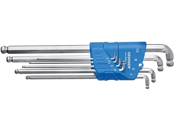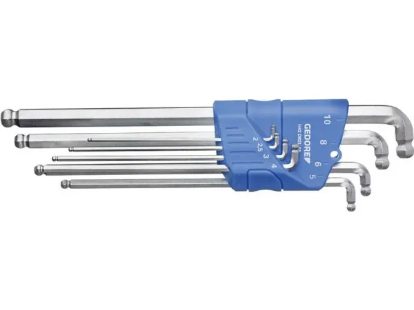 Particularly suitable for confined spaces in view of a double ball end and short angled side. Easy to use where normal hexagon allen keys would fail thanks to improved accessibility and a low profile. Rapid progress in work since the two ball ends allow protrusions to be gone round. Reduces the risk of injury to the fingers when working on flat surfaces. Gedore vanadium steel 59CrV4, zinc-plated.