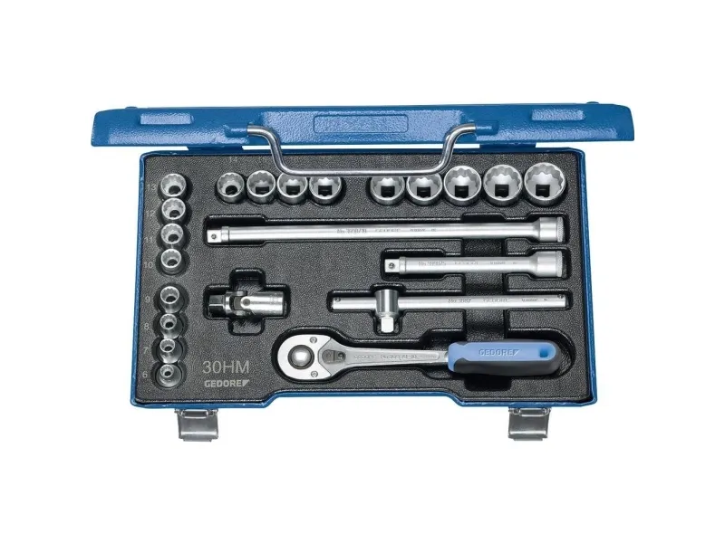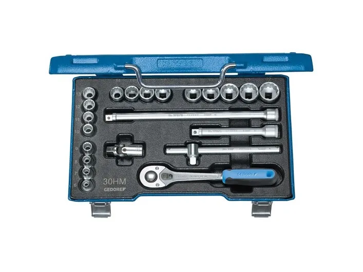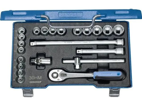 With forged, tempered hexagon (no. 30) or bi-hexagon (no. D 30) UD profile sockets, hand-operated. With accessories made from Gedore vanadium steel 31CrV3. Set U-3 with fine toothed, dial change ratchet. Set U-10 with reversible lever change ratchet. In Gedore blue sheet steel case. Dimensions: 320 x 210 x 55 mm.