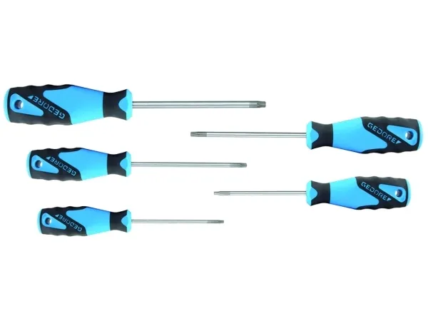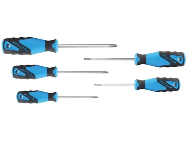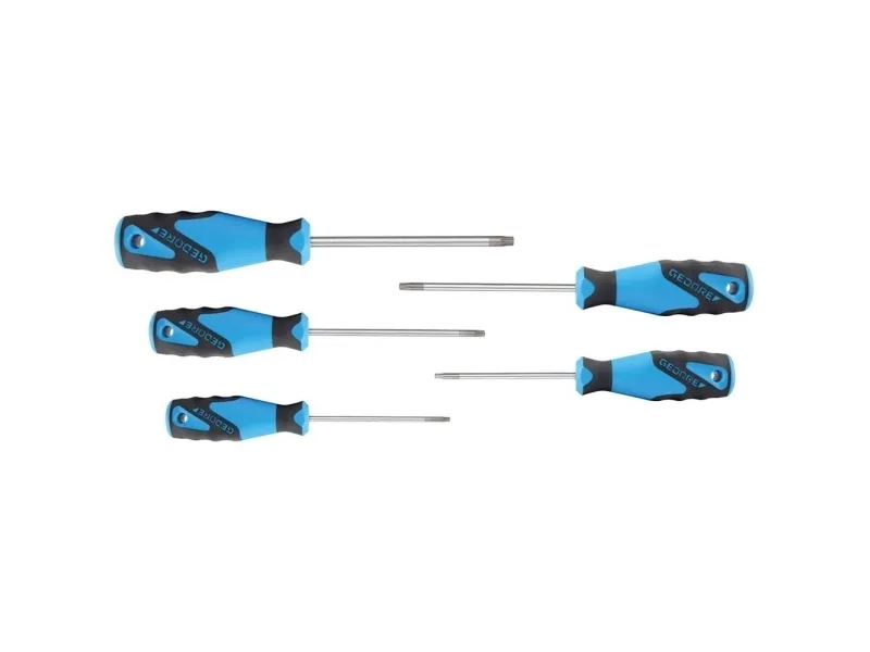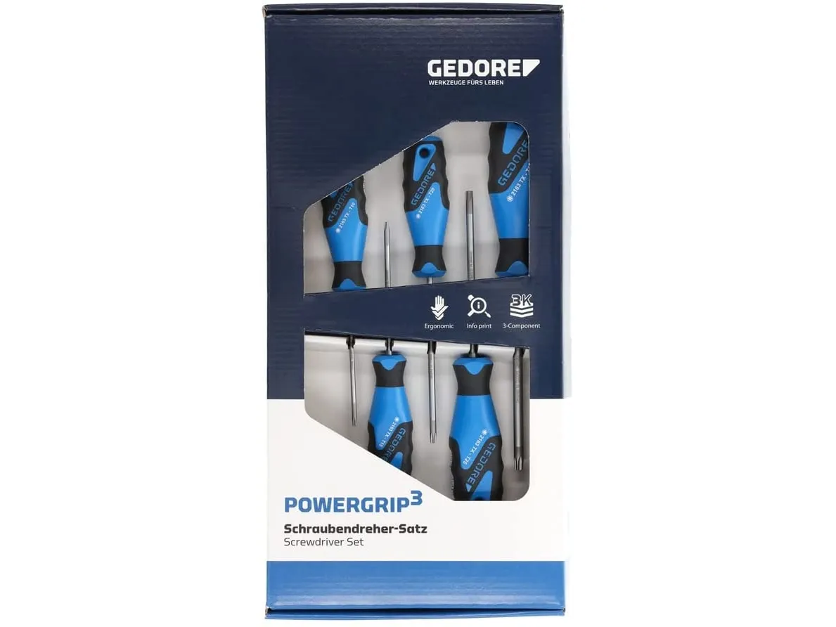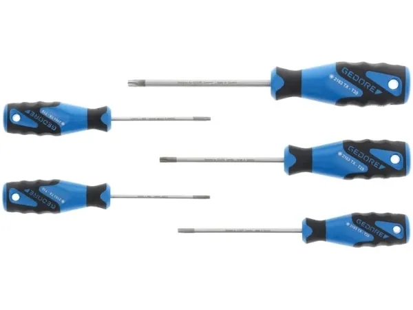 For recessed TX head screws 3-component handles Power-Grip3 with hanging hole Ergonomic handle design enables precise and fatigue-free working Positive-fit joint of handle and blade for optimum transmission of force Type of drive marked at end of the handle Blade from GEDORE molybdenum-vanadium-Plus tempered steel Blade from GEDORE molybdenum-vanadium-Plus tempered steel
