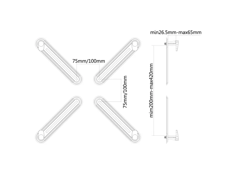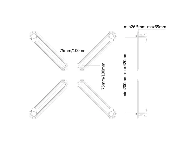 The Neomounts monitor adapter kit, model FPMA-VESANON, is an innovative mounting solution for you to mount monitors without VESA compatibility to a monitor desk or wall mount. The adapter is designed to fit any VESA monitor mount with 75x75 and 100x100mm mounting holes, and includes all required screws and other hardware for assembly. The adapter uses a four-arm system to adjust to the different external dimensions of flat-panel monitors and clamp them in place securely. This adapter supports most 13"-27" monitors with thickness of 25.5mm to 45.5mm. It allows your non-VESA monitor to be mounted on almost any ergonomic monitor arm and to be adjusted for improved viewing comfort. All installation material is included with the product.