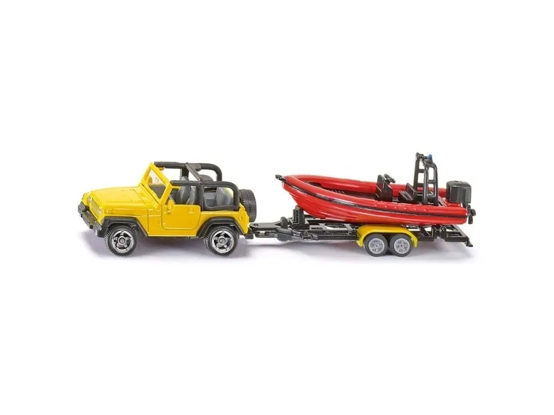 The convertible Jeep Wrangler with motor boat and trailer conjures up fun and leisure activities with a touch of the California feeling. Towing the plastic motor boat to the next sporting yacht harbour on the die-cast metal trailer is easy for this solid Jeep!