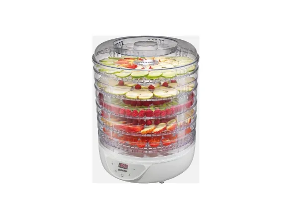 The Gorenje FDK24DW is a versatile food dehydrator designed to meet various drying needs. With a round shape and a see-through design, users can easily monitor the drying process. The adjustable thermostat and convection fan ensure consistent temperature control and efficient drying, reaching a maximum temperature of 70 °C. The electronic control allows for precise settings, complemented by a timer that can be set from 0.5 to 19.5 hours, making it convenient for different drying tasks. This food dehydrator comes with five drying trays, offering ample space for a variety of foods. The tray height adjustment feature provides flexibility in accommodating larger or smaller items as needed. Constructed from both plastic and metal materials, the Gorenje FDK24DW is durable while remaining easy to clean and manage. Additionally, the non-slip feet ensure stability during operation, enhancing safety and user experience.