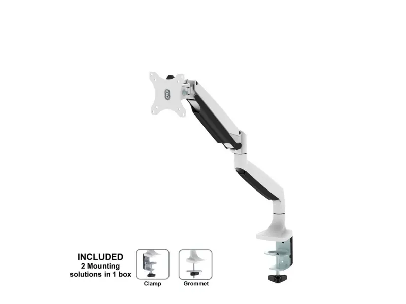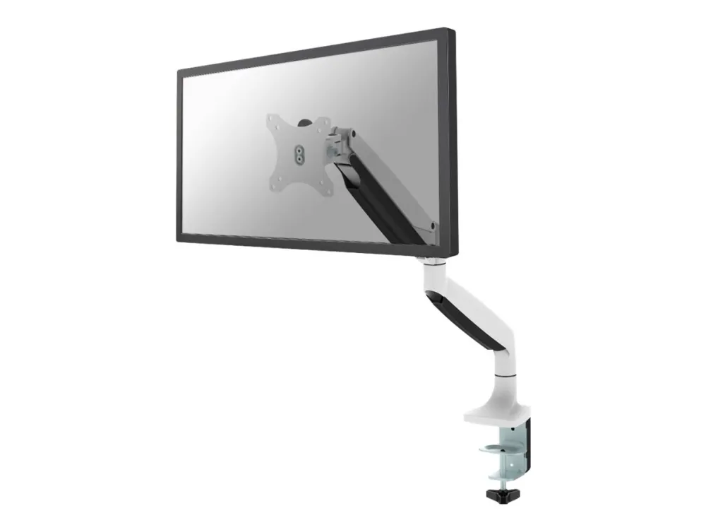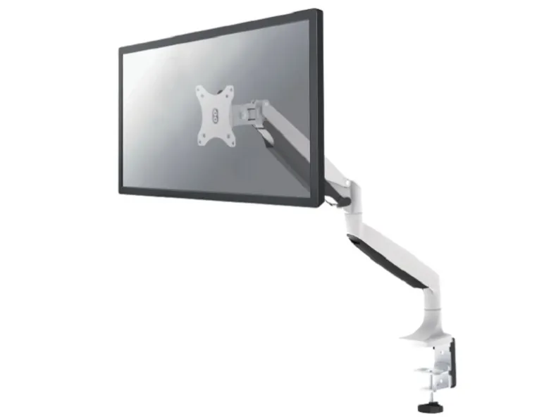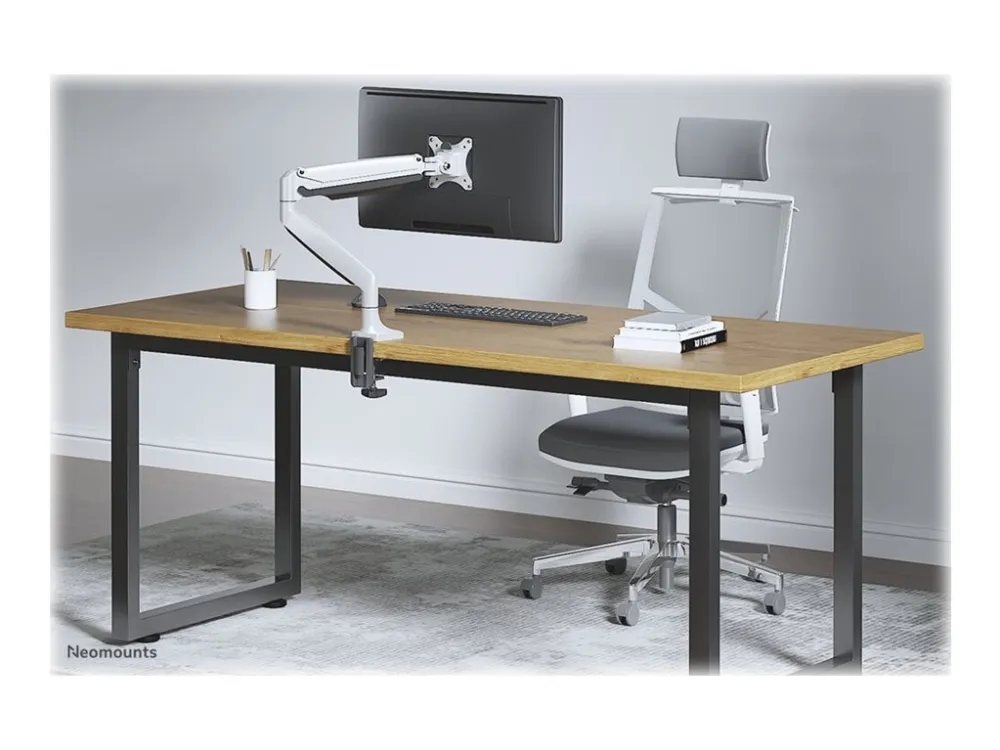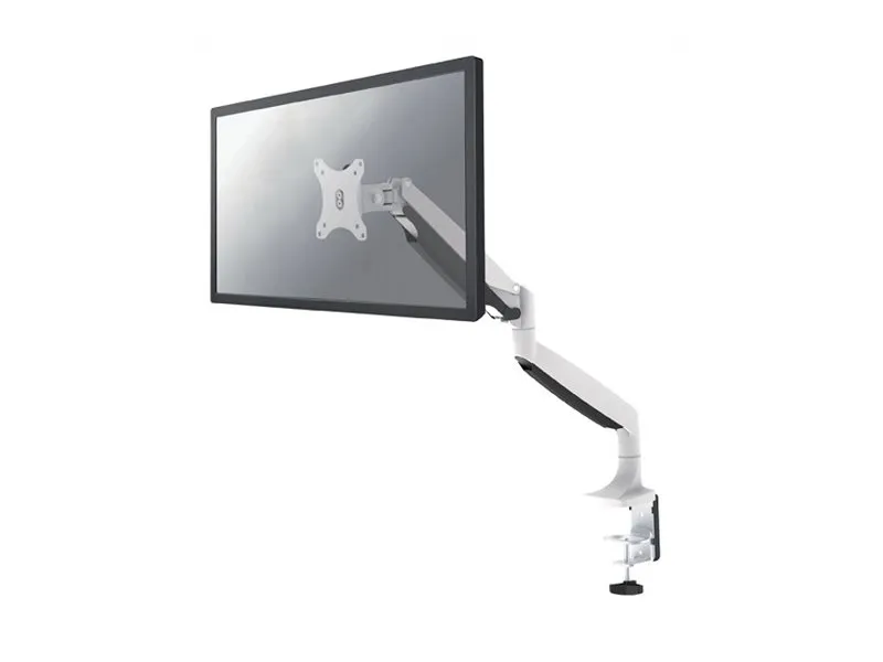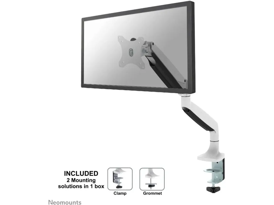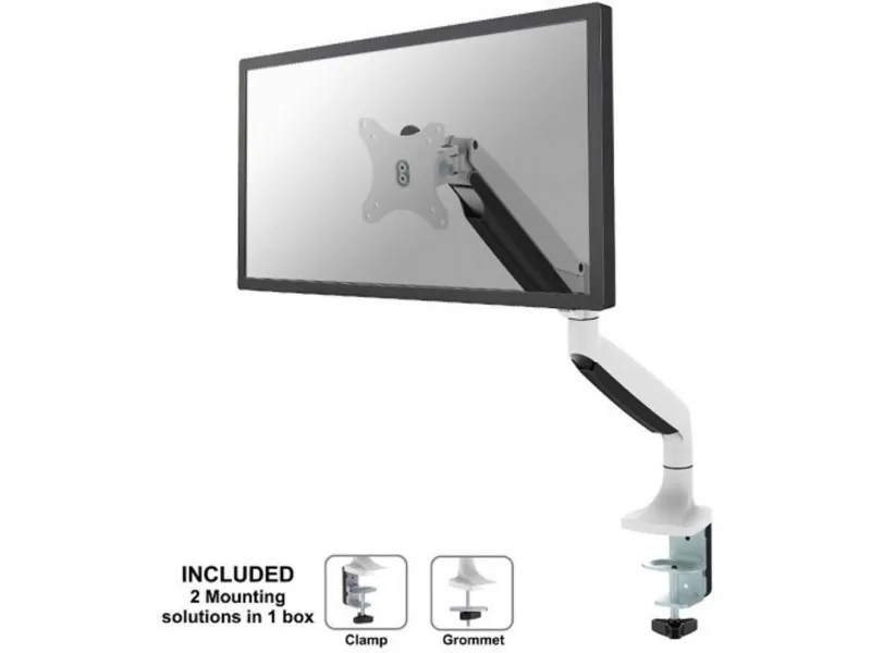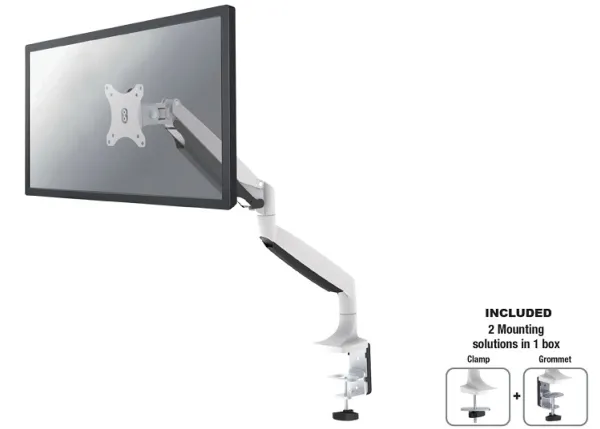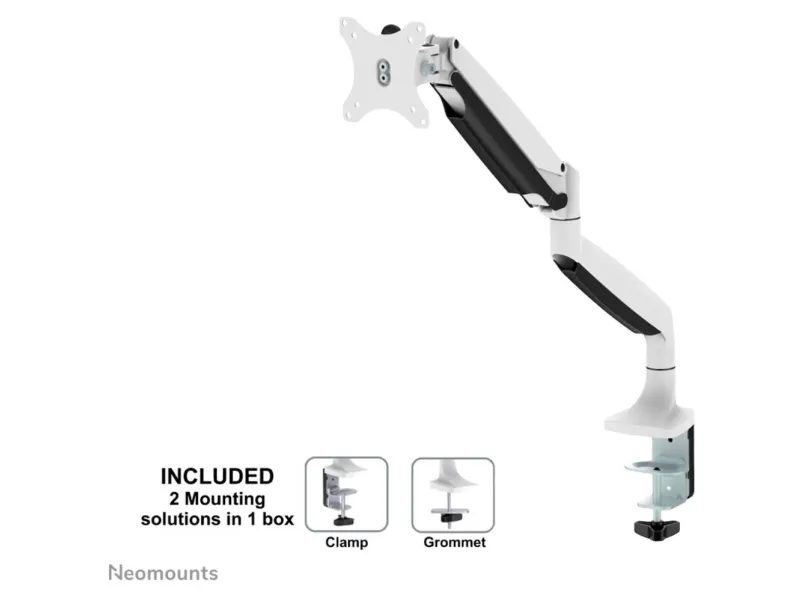 The Neomounts desk mount, model NM-D750WHITE is a tilt, swivel and rotatable desk mount with gas spring for flat screens up to 32". This mount is a great choice for space saving placement on desks using a desk clamp or grommet mount. Neomounts unique tilt (180°), rotate (180°) and swivel (360°) technology allows the mount to change to any viewing angle to fully benefit from the capabilities of the flat screen. The mount is easily height-adjustable from 17 to 51 centimeters using a gas spring. Depth-adjustable from 0 to 61 centimeters. A unique cable management conceals and routes cables from mount to flat screen. Hide your cables to keep the workplace nice and tidy. Neomounts NM-D750WHITE has three pivot points and is suitable for screens up to 32" (82cm). The weight capacity of this product is 9kg each screen. The desk mount is suitable for screens that meet VESA hole pattern 75x75 or 100x100mm. By using an ergonomic mount neck and back complaints can be avoided. Ideal for use in offices and on counters or in a reception area. All installation material is included with the product.