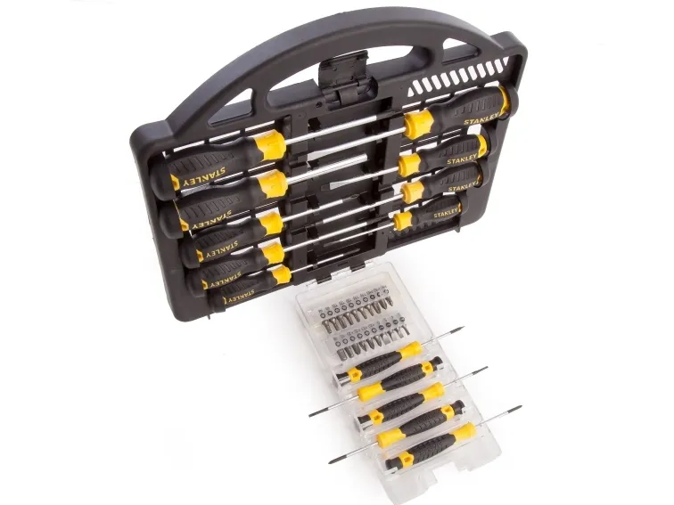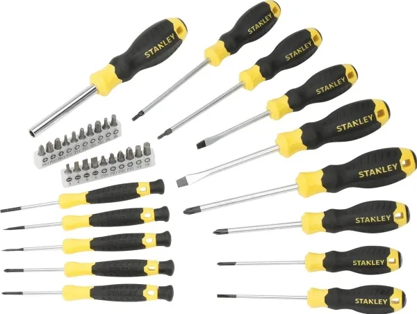 The STANLEY screwdriver set is designed for durability and ease of use with its 34 included pieces. Crafted from chrome-vanadium steel, this set ensures longevity and strength, suitable for a variety of tasks. The soft grip handle provides comfort during extended use, while the corrosion-resistant features maintain the screwdrivers' quality. Compliant with ANSI standards, this screwdriver set is an essential addition for professionals and DIY enthusiasts looking for reliable tools.