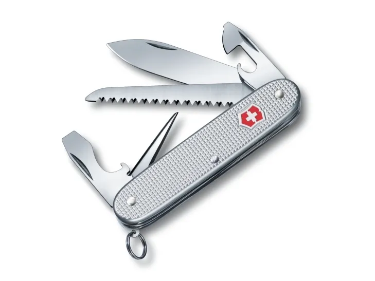 The classic soldier's knife with a saw\nInspired by the classic soldier's knife, this sturdy knife combines lots of useful functions in a durable fluted Alox handle – incuding a wood saw and a reamer.\n- large blade\n- reamer\n- can opener with\n- small screwdriver\n- cap lifter with\n- screwdriver\n- wire stripper\n- woodsaw\n- key ring