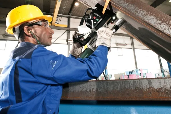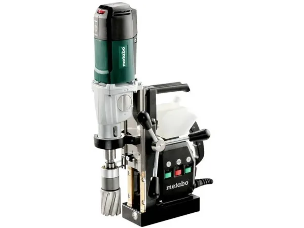 - Large stroke, therefore suitable for use of core drills, spiral drills and countersinks - Magnetic base with high holding power permits working on vertical surfaces and overhead - Robust Metabo marathon motor with internal wiring for long service life - Vario-Tacho-Constamatic (VTC)-Full Wave Electronics for work with materials requiring customised speeds, which remain constant under load - Overload protection: protects the motor from overheating - Clockwise/anti-clockwise rotation with thread cutter - Durable two-speed gearbox with oil bath lubrication for ideal speeds - Integrated coolant container for easy to dose internal cooling of the core drill - Bright LED light for easy alignment in poor light conditions - Swarf protection can be fixed without tools and protects the user from metal shavings and tool contact - Protective circuit starts motor only if the magnet is activated - Restart protection: prevents unintentional start-up after power supply interruption - Lockable slide for comfortable tool change - Handle for easy carrying and lifting - Resistant mains cable (5 m) with rubber shroud