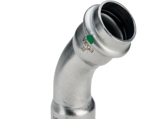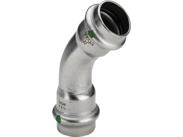 Sanpress INOX med SC-Contur I den aktuelle korrosionsstandard DIN EN 12502-4 anføres, at rustfrit ståls modstandsdygtighed især over for klorid stiger i takt med et stigende molybdænindhold (side 6, 5.2.2 Materialeegenskabernes indflydelse). Derfor anvender Viega kun materialet 1.4401 og 1.4404, som iht. DIN EN 10088-2 skal have et molybdænindhold på mindst 2,0 %. Dog anvender Viega udelukkende rør og fittings med et molybdænindhold, som ligger mellem 2,31 og 2,34 %. Sanpress INOX ligger med et molybdænindhold på 2,31-2,34 % klart over standardkravene og er på dette punkt førende på det tyske marked. Hos de fleste udbydere er indholdet af økonomiske grunde stadig begrænset til ca. 2,0 %. Sanpress INOX er VA-godkendt til 250 mg/l klorid. Sanpress INOX leveres i dimensionerne: 15-18-22-28-35-42-54-64-76,1-88,9-108 mm.