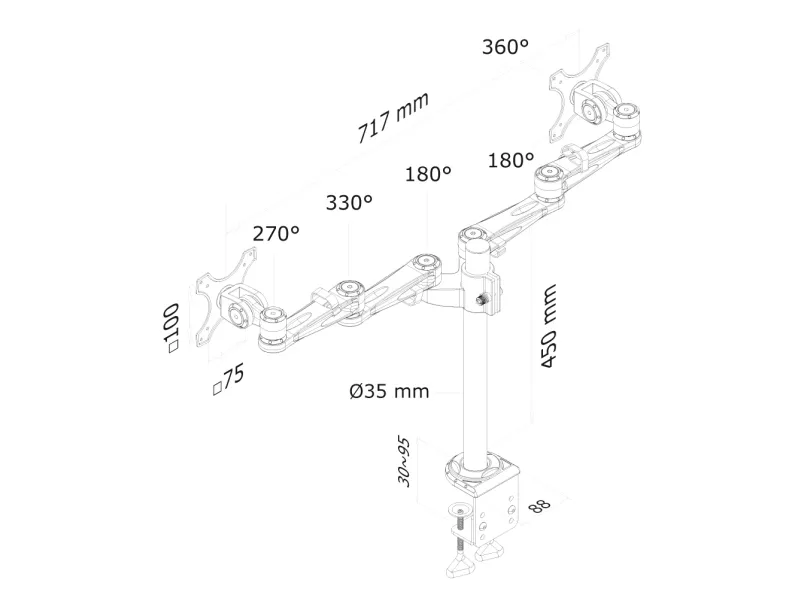 The Neomounts desk mount, model FPMA-D935D is a tilt, swivel and rotatable desk mount for 2 flat screens up to 27". This mount is a great choice for space-saving placement on desks using a desk clamp. Neomounts versatile tilt (180°), rotate (360°) and swivel (300°) technology allows the mount to change to any viewing angle to fully benefit from the capabilities of the flat screen. The mount is manually height-adjustable from 0 to 50 centimeters. Depth-adjustable from 12 to 50 centimeters. An innovative cable management conceals and routes cables from mount to flat screen. Hide your cables to keep the workplace nice and tidy. Neomounts FPMA-D935D has three pivot points and is suitable for screens up to 27" (69cm). The weight capacity of this product is 6kg each screen. The desk mount is suitable for screens that meet VESA hole pattern 75x75 or 100x100mm. By using an ergonomic mount neck- and back complaints can be avoided. Ideal for use in offices and on counters or in a reception area. All installation material is included with the product.