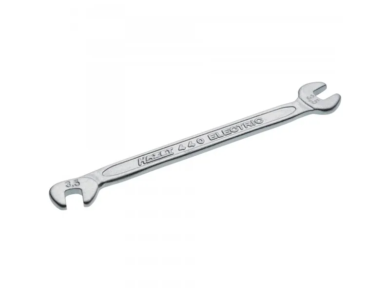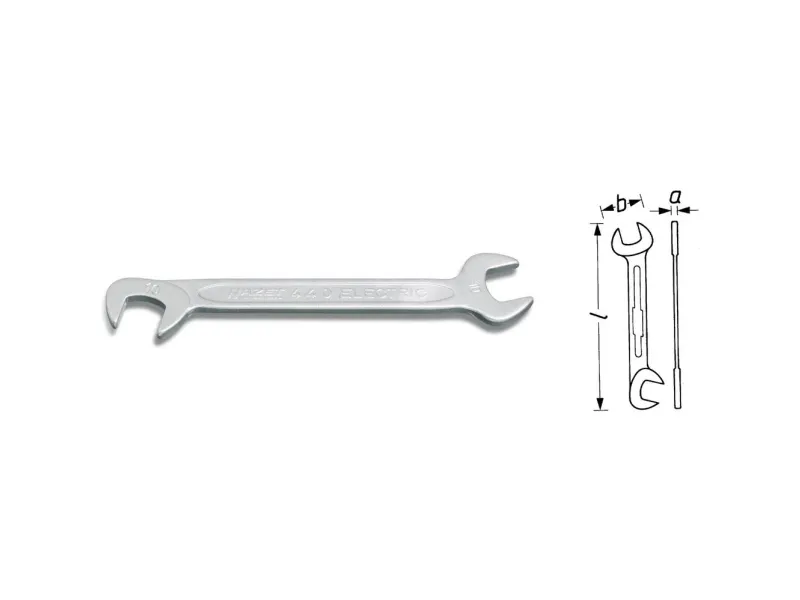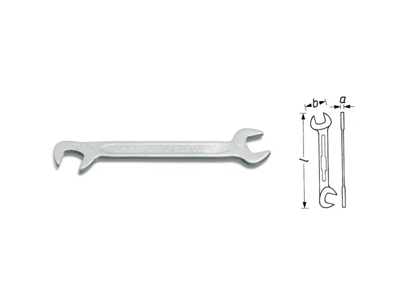 Dobbelt-gaffelnøgle · Ved trange pladsforhold. · Gaffelstilling 15° og 75°. (Samme nøglebredde). · Korte, tynd udførelse. · Overflade: Forkromet. Made in Germany
