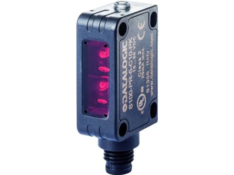 The S100 series is a standard miniature sensor with dimensions of only 20 x 32 x 12 mm. It stands out as a new benchmark among miniature photoelectric sensors with its unique characteristics. With four fixing holes (two threaded on the front and two slotted on the rear), the series offers a universal solution suitable for all types of equipment and applications. The absence of the adjustment makes the installation of the S100 photoelectric sensor quick and easy, eliminating any risk of tampering. With Datalogic's new ASIC, the S100 becomes programmable and adjustable through IO-Link connectivity with dual output channels and no digital output jitter during communication, extending the sensor line with the new contrast sensors (W00 models) which are fast, precise and reliable.