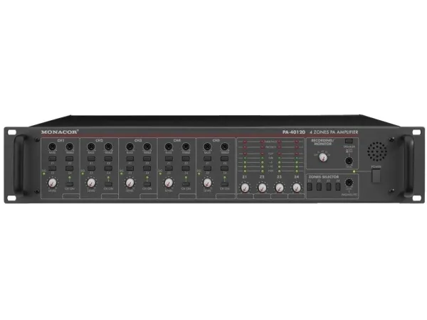 With optional zone-paging microphone PA-4000RC, the amplifier can be extended to a 4-channel PA system. In combination with an integrated voice memory, an alarm system can be set up in schools, for example.;#4 x 120 W;#4 zones, can be controlled individually;#3 mic/line inputs and 2 line inputs;#Built-in adjustable monitor speaker;#Chime and siren can also be activated via external momentary push-button;#Bass, treble and master controls, level display via LEDs, regulated fan;#15 V phantom power for electret microphones;#Connection for microphone PA-4000PTT;#Optional connection for up to 32 zone paging microphones PA-4000RC;#Mains operation and 24 V emergency power operation;;Manufacturer information:;MONACOR INTERNATIONAL GmbH & Co. KG