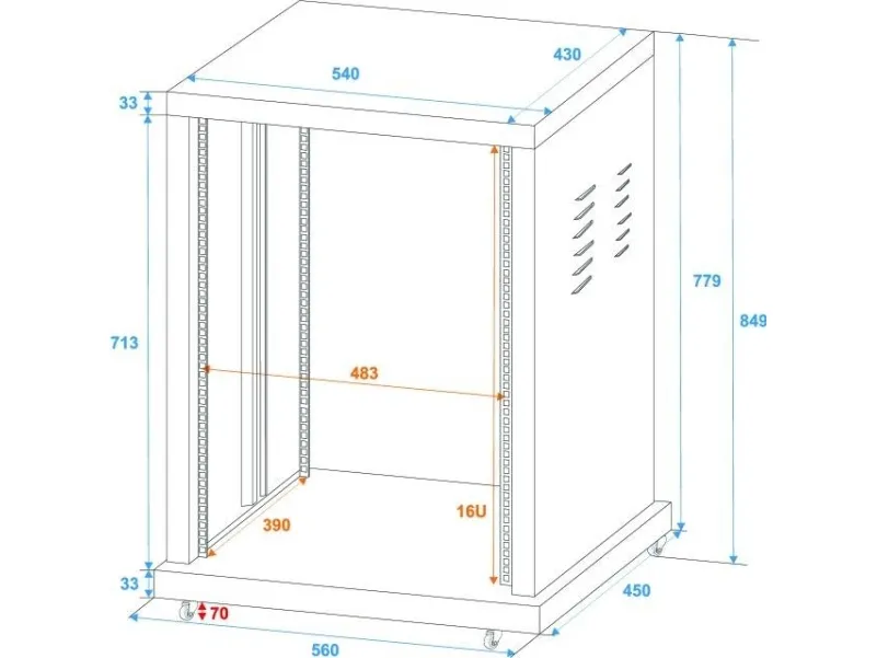 Den ultimative løsning til alle faste installationer · sort pulverlakeret overflade · udstansede rack-skinner foran og bagved · 4 styrehjul, · integrerede støtteskinner i siderne til tunge apparater som for eksempel sluttrin · holdemøtrikker, Skruer og plastikskiver medfølger · indbygningsdybde 41 cm · levering sker ved nedskæring · samlevejledning kan fås til download på omnitronic.com · kan fås i forskellige højdeenheder (1 HE = 44 mm)