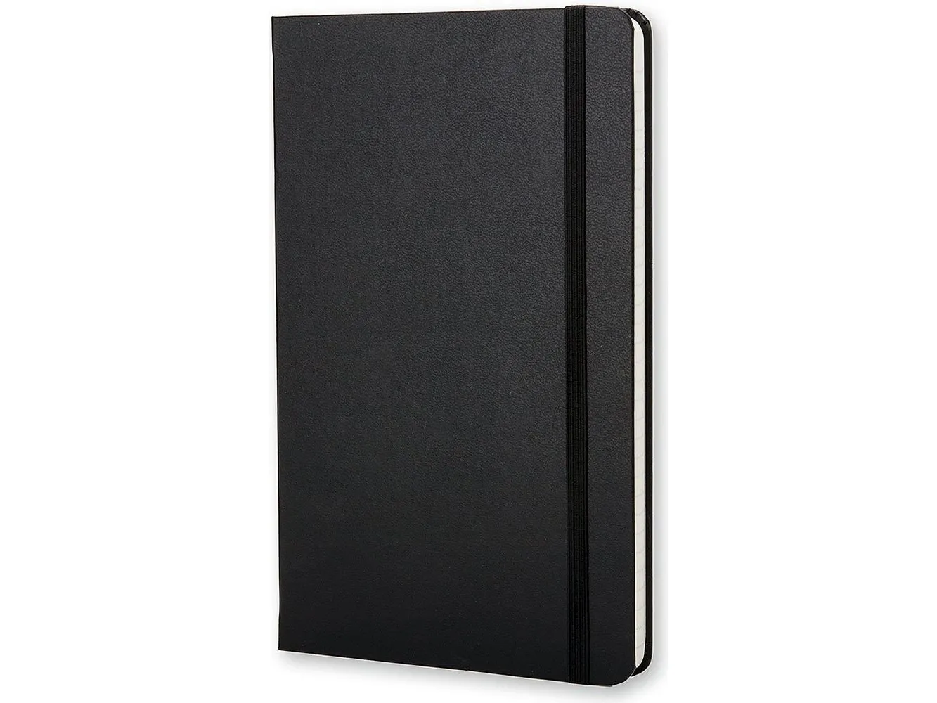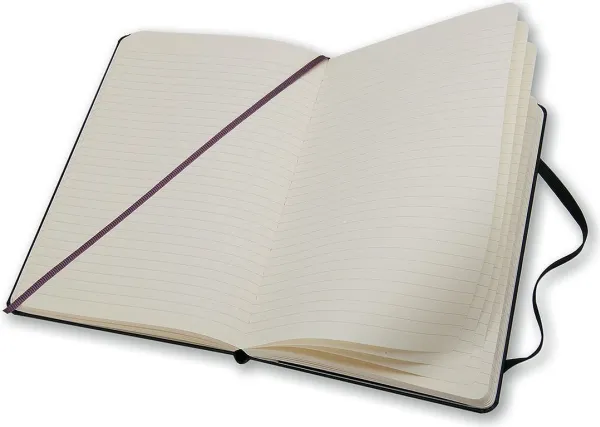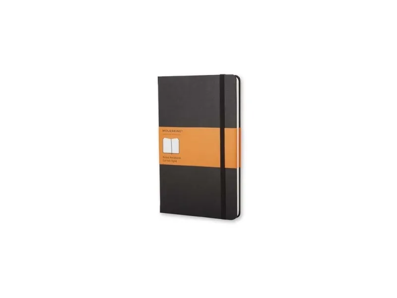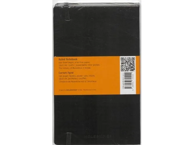 This basic, yet classic Large Ruled notebook is one of the best selling Moleskine notebooks. This reliable travel companion, perfect for writings, thoughts and passing notes, has a cardboard bound cover with rounded corners, acid free paper, a bookmark, an elastic closure and an expandable inner pocket that contains the Moleskine history.