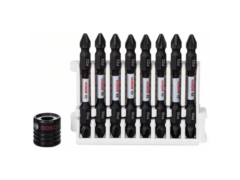 Dobbeltklingebit-sæt Impact Control, 9-dele, PH2-PZ2, 65 mm, magnethylster Skruebit med dobbeltklinge er yderst robust og ideal - selv ved et stort drejemoment Den specielle torsionszone giver bits ekstrem holdbarhed for permanent belastning. S2-modificeret stål og optimeret varmebehandlingsproces giver maksimal holdbarhed til toppræstationer, selv ved omfattende monteringer og tungt industriarbejde. Det har et udvendigt sekskantsskaft af størrelsen 1/4 tommer til anvendelse med boreskruer, skruetrækkere og særligt med slagskruer. Denne bit er en del af Bosch pick and Click-systemet, der kan sammensættes individuelt af tilbehørssæt til absolut fleksible bit-sortimenter. Raster-indskub sikrer enkeltvis købte bipacks til en individuel samling og nem udskiftning af gamle bipacks. 36-delt pick and Click Impact Control skruebitsæt indeholder også topnøgle samt Impact Control-universalholder med standardmagnet og Impact Control-Universal holder Quick Release. Denne holder er ideal for god fastholdelse af bits ved generelt skruning med elværktøj. Quick-CHANGE-funktionen muliggør derimod hurtige og enkle bitskifte og en kraftfuld pasform på bits. Længde mm: 65