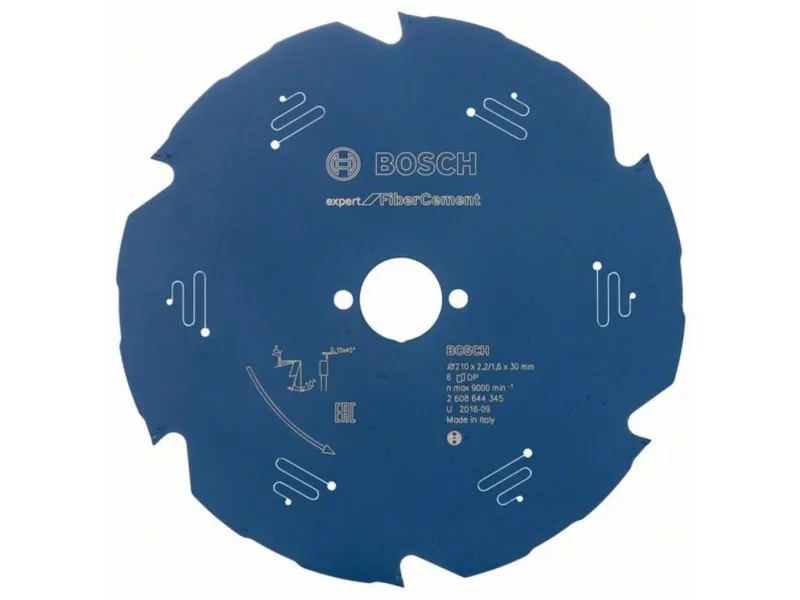 Rundsavsklinge Expert for Fibre Cement, 210 x 30 x 2,2 mm, 6 Expert for Fibre Cement rundsavsklinge er meget robust ved skæring af fibercement. Det er udstyret med PCD-tænder (polykrystallinsk diamant), hvilket sikrer en ekstremt lang levetid. Ydeevnen understøttes af beskyttelsesbelægningen, korrosion forhindres og pålidelig skæring muliggøres, mens friktion reduceres. Produktet er udstyret med dæmpningsslidser til særlig rolig drift, betydeligt mindre støj og mærkbart lavere vibration. Expert for Fibre Cement rundsavsklinge har TCG-tænder (Triple Chip Grind) for højeste robusthed og en lang levetid. Udvendig diameter mm: 210, boring mm: 30, skærebredde (b1) mm: 2,2, stampladetykkelse (b2) mm: 1,6, skærebredde (b1) mm / grundklingetykkelse (b2) mm: 2,2/1,6, tandantal: 6, tandform: TCG, maks. Rotationshastighed (omdr/min): 9000, snitresultat 2, NL/diameter TKS: 2/7/42, spånvinkel ° w1: 10, frivinkel ° w2: 10
