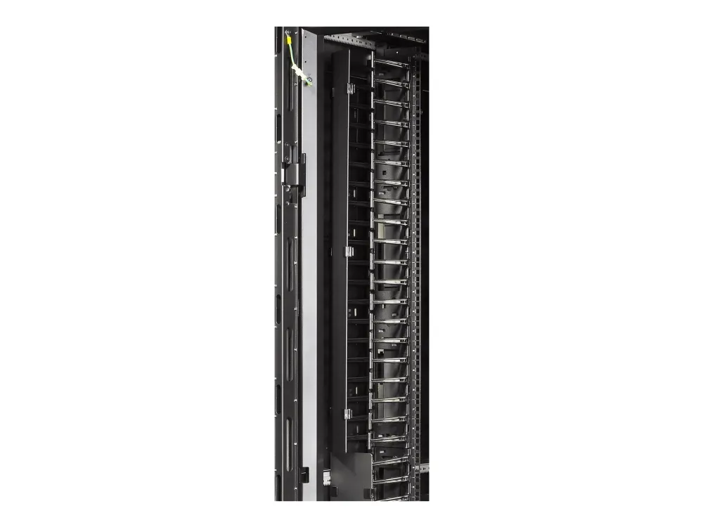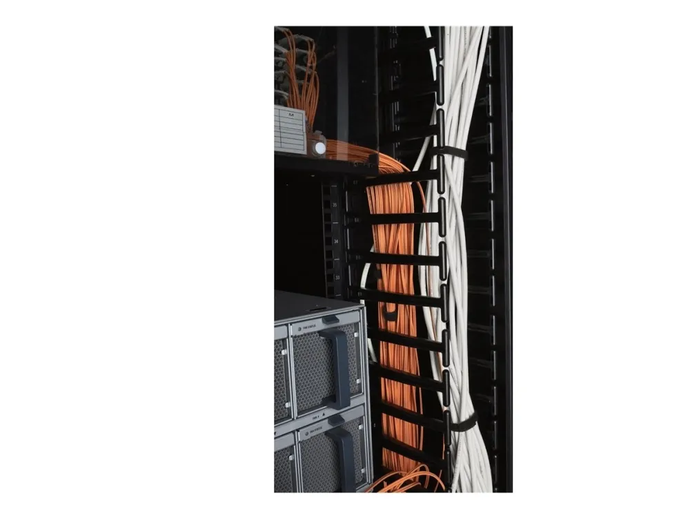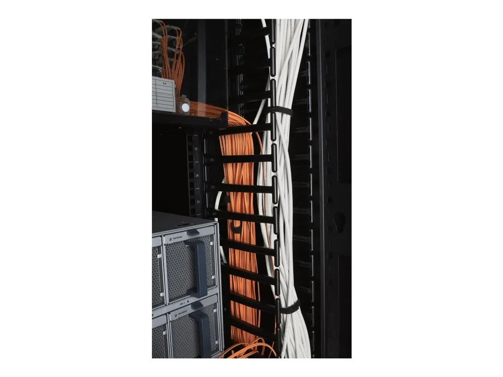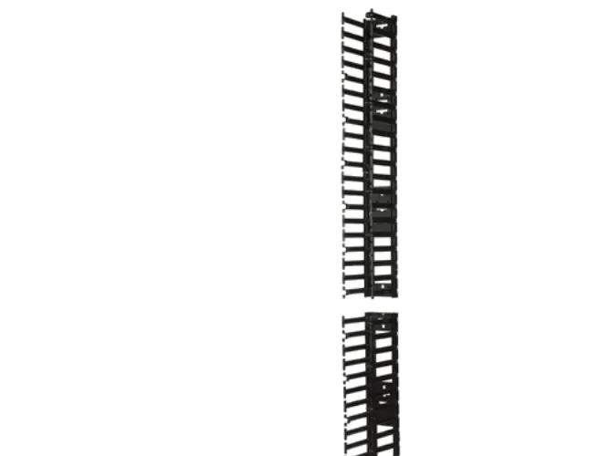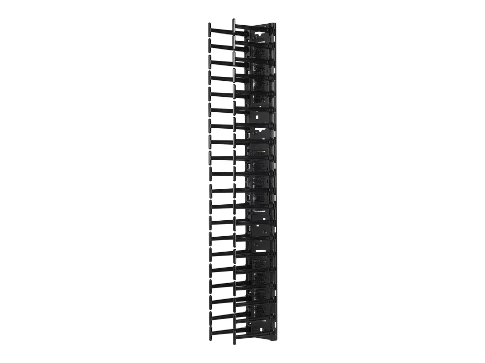 The vertical channels have smooth plastic fingers at 1U increments to allow patch cords to enter and exit in an organized manner.