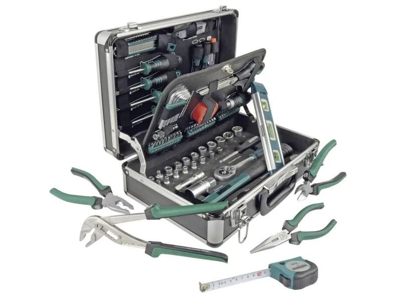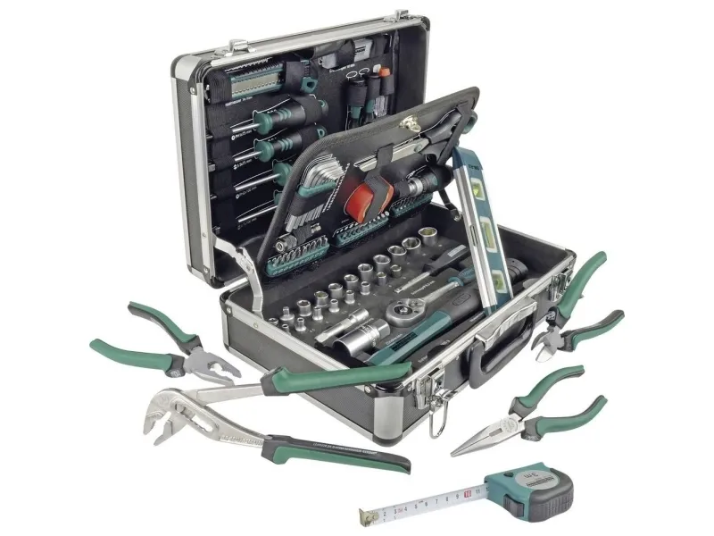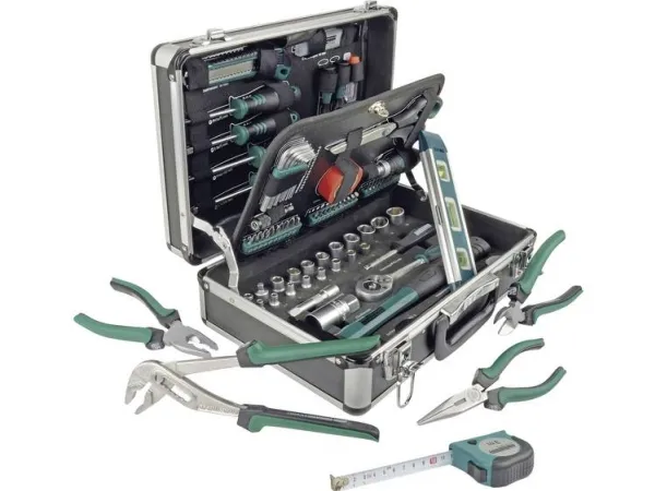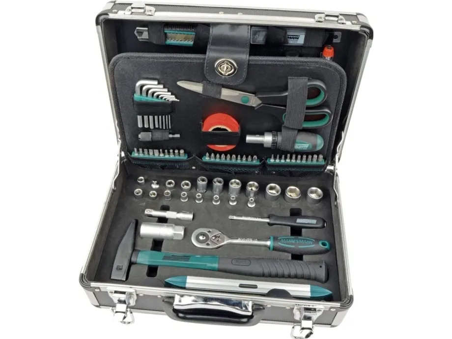 Alu-værktøjskuffert 90 dele. Værktøjer er enten fremstillet af førsteklasses værktøjsstål eller af krom-vanadium stål og er oftest GS-testet. Kuffert kan aflåses Værktøjer opbevares sikkert og overskueligt