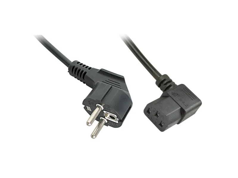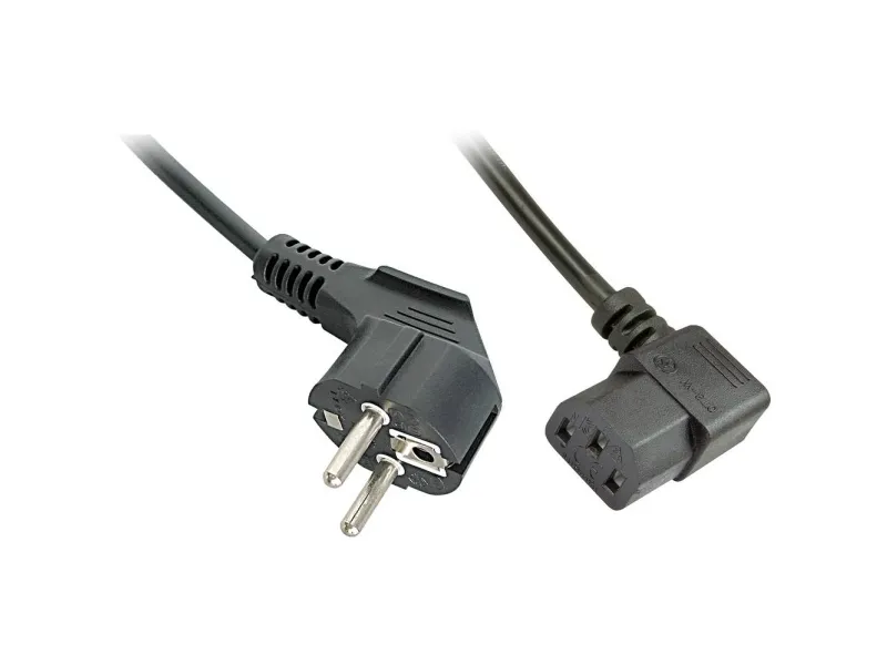 Power cable with 90 ° angled IEC power connector for connecting PC, screens, printers, etc. with IEC connection to the German and French power supply network.