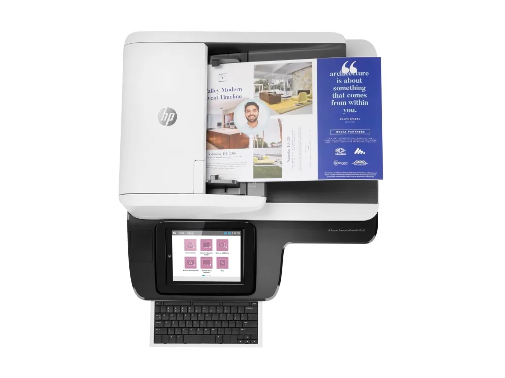 Skanning til bærbar USB-stasjon, Automatic Image Orientation, automatisk fargedetektering, Auto Crop, innbygd High Performance Secure Hard Disk, 8" berøringsfølsom TFT-skjerm, innbygd tastatur, Hardware Integration Pocket (HIP), HP EveryPage, OCR Text Recognition