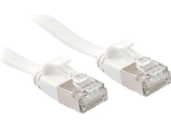Lindy kat.6A U/FTP fladt patch-kabel, hvid, 5 m Fladt patch-kabel er yderst fleksible og tynde kabler til særlige formål. Med den ekstremt tynde konstruktion kan disse kabler under tæpper, laminat / parket eller mellem panel og væg. Endda døre og vinduer er også ved en installerede kabler stadig fuldt funktionsdygtig.
