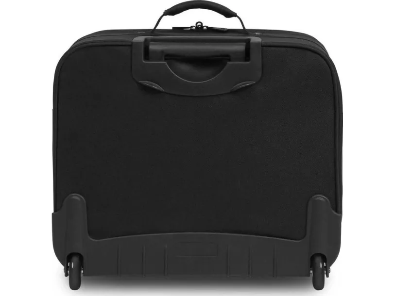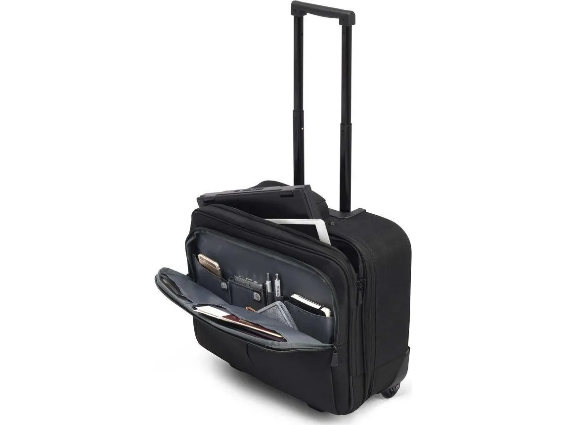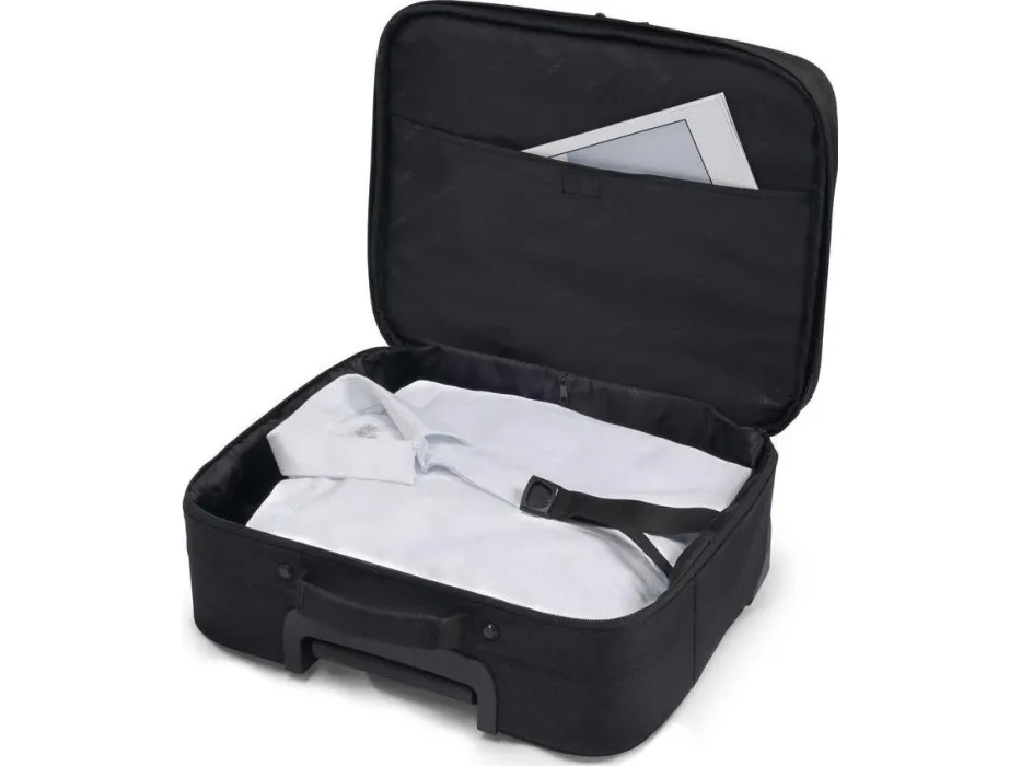 Your 14-15.6" notebook is triple protected: with High-Density Foam (HDF) padding, a fastening strap and a divider for fixing the device in the lockable notebook compartment, and reinforced frame. Even your tablet (up to 10.5") can be safely stored in the padded slip pocket. The generous main compartment offers plenty of storage space for clothing and other luggage. Functional fastening straps as well as an additional slip in pocket for documents establish order in the interior. The spacious front compartment with a practical and easy-access workstation for you mobile accessories allows you to organise your personal items with holders for items such as pens, business cards, IDs and smartphone. The reinforced bottom part, interchangeable quality-wheels, a robust two-stage telescopic handle made of high-class aluminium and a comfortably moulded, riveted carry handle assure long-lasting transportation comfort.