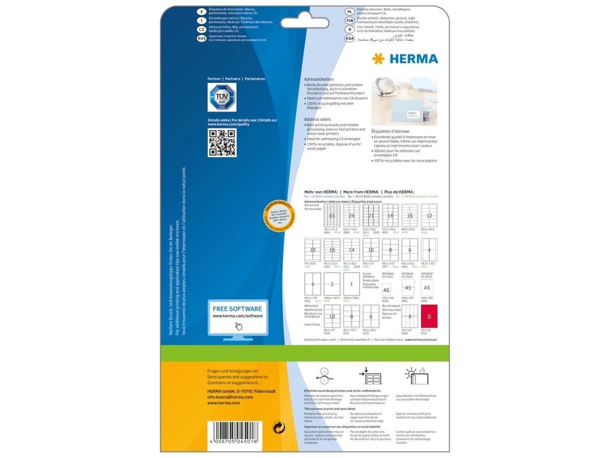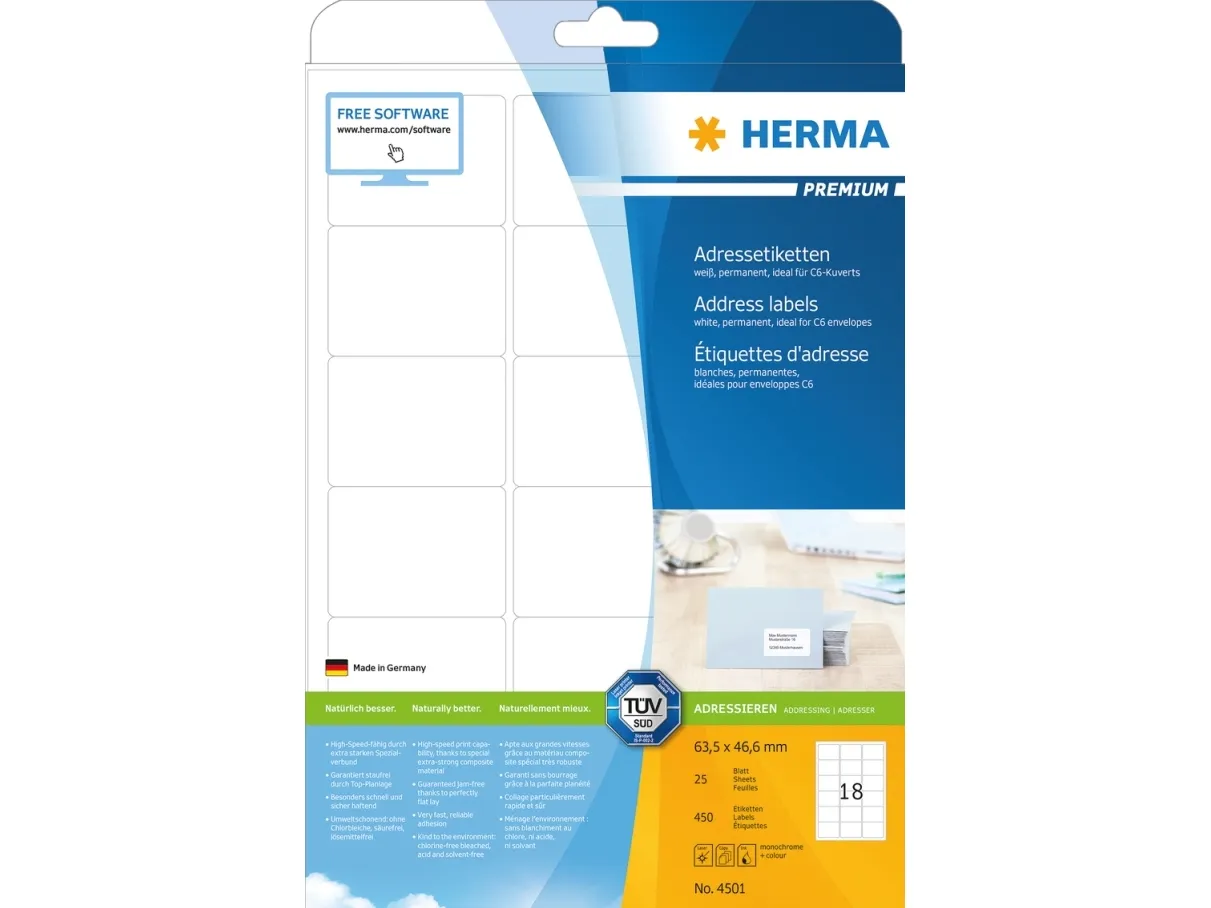 - Self-adhesive labels on A4 sheets, permanent adhesion - Perfect for all laser printers and inkjet printers, copiers, colour laser printers and colour copiers - High whiteness and uniform surface for perfect printing results in black-and-white or colour - Perceptibly thicker: extra-strong labels - easy to affix - Very fast, reliable adhesion, even on cool, moist surfaces - Guaranteed not to jam, with high-speed capability thanks to extra-strong special laminate, perfectly flat lay and all-round protective edge - Kind to the environment and sustainable: chlorine-free bleached, PEFC-certified, CO2-neutral, solvent-free adhesive - Labels are 100% recyclable, dispose of as for waste paper, packaging made from recycled cardboard - Free software solutions
