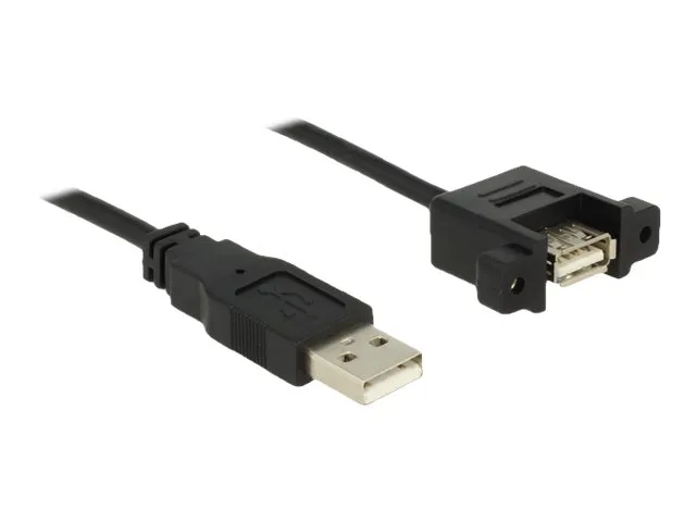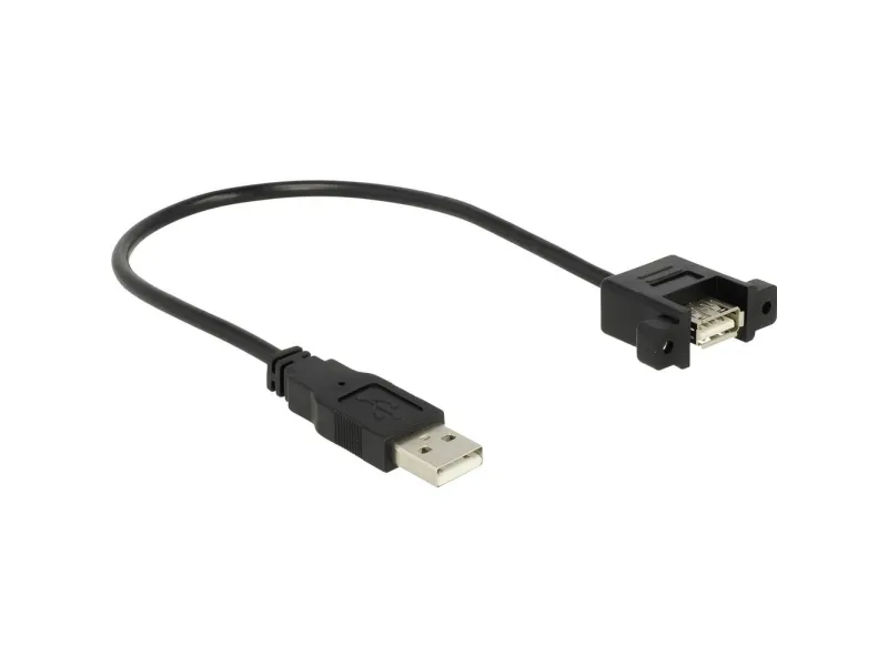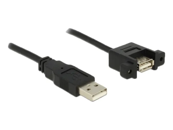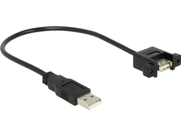 This cable by Delock can be used to extend an USB connection and to connect various devices. The female port can be attached with two screws, e.g. to a slot bracket, a cable duct or an enclosure with the corresponding opening. In this way, it is possible to install a USB connector in an easily accessible position.