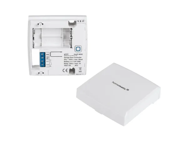 Individuel konfiguration og nem ibrugtagning via HOMEMATIC WebUI · komfortabel styring af garageporten direkte på enheden, via trådløs fjernbetjening eller via diverse partner-apps · særligt robust takket være stabil kabinetkonstruktion · fleksibel anvendelse valgfrit med batterier, Via strømforsyning eller garageportdrev · enkel montering og installation med medfølgende skruer og dyvler samt den kabelgennemføring på bagsiden.