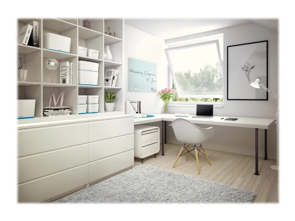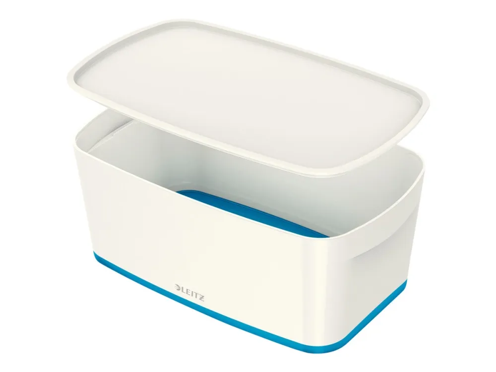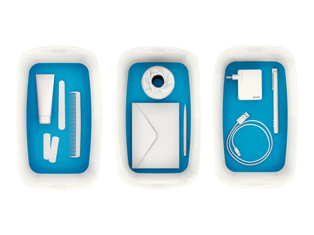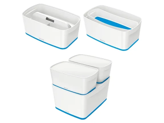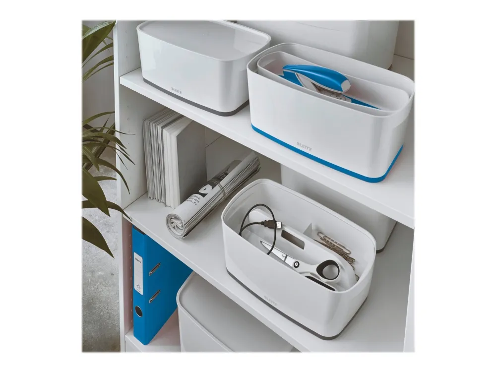 The Leitz MyBox® modular storage system lends an unique style to your home or office. The storage box is sturdy and made of premium quality material in a high gloss finish with a dual colour effect. For quick, easy and attractive storage of A5 documents and various accessories. The modular system allows for optimal content management solutions. Complements dual colour products from the Leitz WOW range.\n\n- Stylish dual colour box for quick and easy organisation and smart storage\n- Combined with the small storage tray or the small organiser tray, this is the optimal content management solution\n- Made out of sturdy, scratch-resistant and waterproof ABS material for premium look. BPA free.\n- Space-saving: Leitz MyBox® Large has stackable fit with 2 x MyBox® Small on standard shelf\n- Discreet snap-in function keeps lid in place while opening remains easy\n- When not being used, the boxes can be stacked inside each other to save space\n- Easy to clean, with soft rounded corners