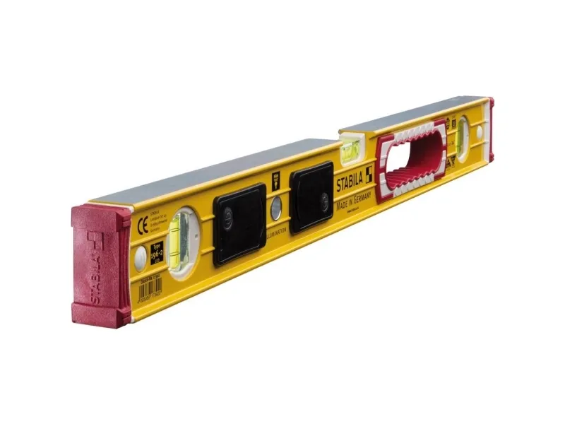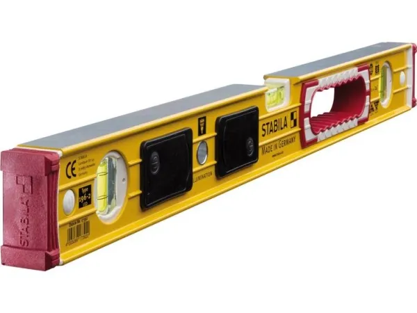 Vaterpas af typen 196-2 LED, 60 cm Ekstra stiv aluminiumsprofil med forstærkningsribber til høj stabilitet og grebåbning for optimal håndtering af to integrerede LED-lyskilder sørger for en intensiv, ensartet belysning - optimal læsbarhed fra horisontal- og vertikal-libelle, Også ved dårlige lysforhold batteriskånende AUTO-SLUK-teknik . Endekapper med skrid-stop - fast hold på vaterpasset ved tegning af støddæmpende endekapper - tokomponent materialemix beskytter profilen ved slag aftageligt - præcis igangsætning og tegning indtil i hjørner med to præcist planfræsede måleflader - ingen misfarvninger på overflader STABILA indbygningsteknologi Til langtidspræcision - målenøjagtighed i normal- og omladningsposition ± 0,5 mm/m udstyr: 1 belyst horisontal-libelle, 1 belyst vertikal-libelle, anden vertikal-libelle ubelyst, 2 fræsede måleflader, gennemgrebsåbning Ugunstige lysforhold besværliggør og forsinker justering og justering af komponenter og tegning. 196-2 LED'er tilbyder løsningen: Takket være den belyste libeller kan du måle præcist og udføre dit arbejde upåklageligt uanset de omgivende betingelser. Den stabile, forstærkede rektangulære aluminiumsprofil og indbygningsteknologien fra Stabila med godt guldset libelle gør apparatet til den perfekte partner til hårde byggepladsindsatser. Vaterpas fra STABILA: Præcision, der holder et liv.