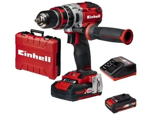 Einhell TE-CD 18 Li-i BL akku-boremaskine med kulfri motor har flere kræfter og kører i længere tid end værktøjer med konventionelle motorer med kulbørster. Akku-boremaskinen er en del af Power X-Change-familien. Det samme Li-ion-batteri og den samme lader kan bruges til alle værktøjer i Power X-Change-familien. Slagfunktionen er en stor hjælp, når du arbejder i hårde materialer. Slagmekanismen har kræfter nok til at bore gennem sten og beton. Akku-boremaskinen har 2 gear, som giver højt moment og hurtig boring. Akku-boremaskinens selvspændende 13 mm metalborepatron med Quick Stop-funktion gør det let og hurtigt at skifte bor og bits. Slagboring udøver en stor kraft på brugeren. Støttegrebet letter belastningen af håndleddene. Det ergonomiske design med softgrip gør maskinen behagelig at bruge. LED-arbejdslyset giver et godt overblik på mørke eller svært tilgængelige steder, f.eks. ved nybyggeri eller i skure. Der medfølger to 2,0 Ah Power X-Change-batterier og lynlader. Akku-boremaskinen leveres i en praktisk kuffert til transport og opbevaring