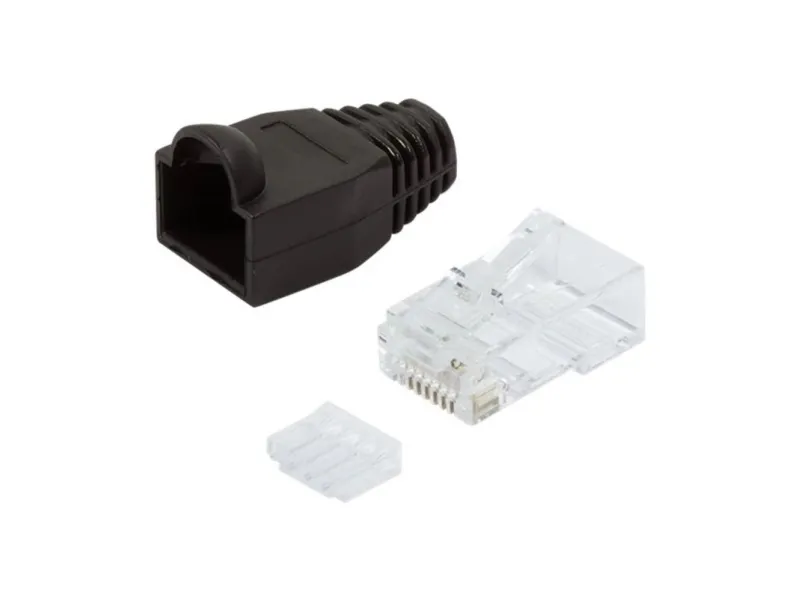 Dette sæt fra LogiLink består af et afskærmet modulære stik til samling af runde kabler RJ45 CAT 5E ifølge EIA / TIA 568A / B og en parring trækaflastning. Artiklen består af henholdsvis 100 sæt i store PE-pose; hvert sæt er igen individuelt i små polybag pakket. Standardiseret certificering fangst næse: UL94V-2 Matching bend relief