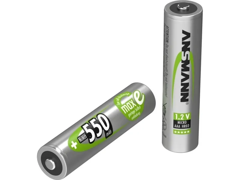 MaxE AAA-batteri Minimal selvafladning · Efter 1 års opbevaring er der stadig 80 % af kapaciteten til rådighed · Lang levetid · Hurtigopladende · Foropladet · Temperaturområde -20 til +50 °C. Batterier med lav selvafladning til Hohem-enhederDen optimale løsning til krævende brugere: Batterierne har en høj kapacitet og alligevel en meget lav selvafladning.Dermed ideal til anvendelse som for eksempel lommelygter, legetøj, modelbygning, spillekonsoller, digitalkameraer, Blitzapparater, medicinske apparater og så videre. MaxE har energi til at forsyne alle dine apparater med strøm.Høje sikkerhedsstandarder og god cyklusstabilitetBatterierne opfylder naturligvis det aktuelt gældende EU-direktiv og lever op til de højeste krav til sikkerhed og lang levetid. Med den bedste cyklusstabilitet kan NiMH-cellerne genoplades op til 1000 gange.Testet kvalitetAnsmann-batterier er testet succesfuldt ud på elektriske, termiske, geometriske og mekaniske krav. Ved strenge test i Tyskland og Fjernøsten kan vi sikre den højeste produktkvalitet. Vores kvalitetseksperter kontrollerer regelmæssigt, at vores høje krav og internationale standarder overholdes.Kan oplades hurtigtBatterierne kan oplades med en høj ladestrøm, hvilket muliggør meget korte opladningstider.Stort temperaturanvendelsesområdeBatterierne kan anvendes ved temperaturer fra -20°C til +50°C. Skåner miljøet og pengepungen NiMH-batterier kan grundlæggende anvendes overalt, hvor der også kan anvendes engangsbatterier. På den måde kan du spare penge og aflaste miljøet.Ingen memory-effektTakket være den nyeste batteriteknologi er memory-effekten udelukket, selv efter flere gange at have ladet noget af det.