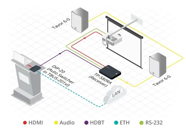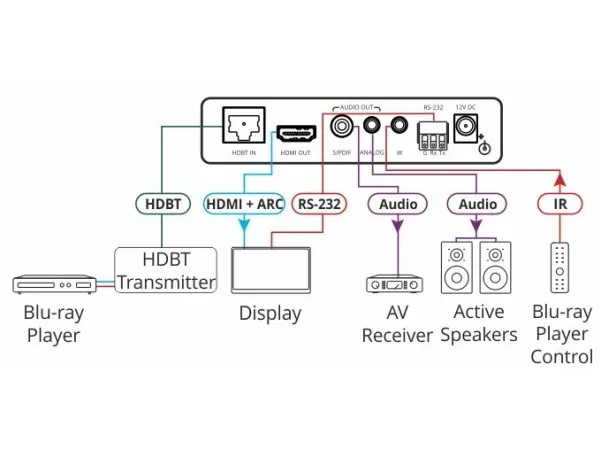 1 x HDMI (utgang) - Type A hunn 1 x RS-232 (toveis) - terminalblokk 1 x IrDA - mini jack hunn 1 x HDBaseT (inngang) - RJ-45 hunn 1 x SPDIF (utgang) - RCA 1 x lyd (utgang) - mini jack