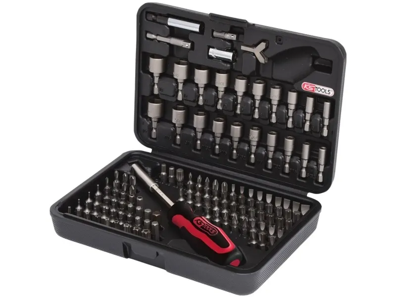 1/4 bit-sæt, 122 dele • Med drev med udvendig sekskant iht. din 3126/ISO 1173 - C 6,3• Til manuel betjening og elektrisk skruemaskine• Inklusive bitholder, 1/4-stikhovedadapter og 1/4 bit-skruetrækkerIdeelt egnet til forskruninger i håndværk og industri• Præcis og ordentlig placering af de mest almindelige 1/4 bits• sandblæst • Special-værktøjsstål• I stabil plastkuffert