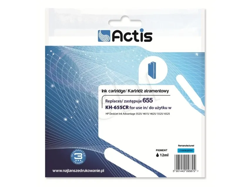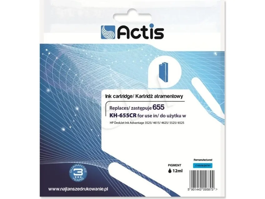 Actis KH-655CR cyan ink cartridge for HP printer, refurbished, 655 CZ110AE replacement, capacity 12 ml, standard yield.