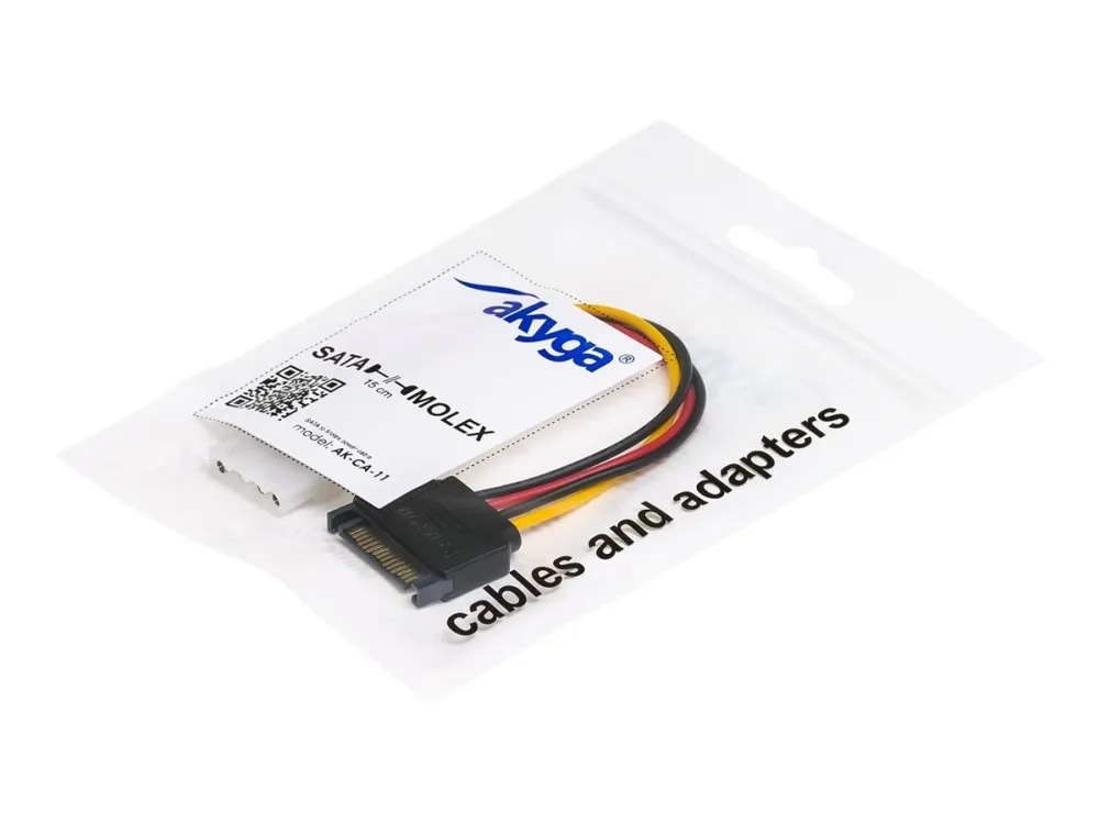 High-quality cable Akyga AK-CA-11 for extra MOLEX connector by connecting to SATA connector. The 15 cm cable extends the power supply, making it easy to connect components, especially in spacious enclosures.