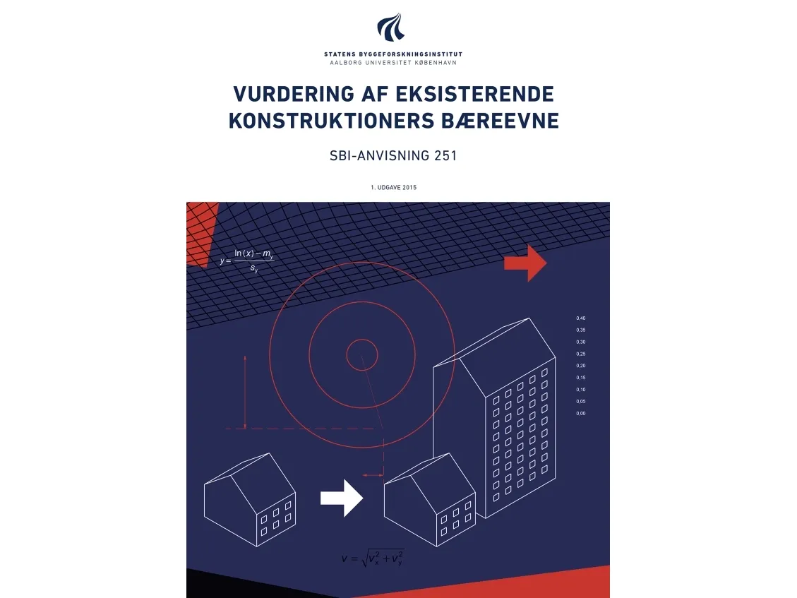 Denne anvisning beskriver, hvordan vurdering af en eksisterende konstruktions sikkerhed kan gennemføres, og hvilke elementer vurderingen kan bestå af. Anvisningen vejleder i, hvornår sikkerheden af en konstruktion bør revurderes, hvilke elementer en revurdering bør indeholde, hvordan en hensigtsmæssig prøveudtagning kan foretages, og hvordan prøvningsresultater kan udnyttes i en bæreevnevurdering svarende til de nugældende regler. Hovedvægten er lagt på fastlæggelse af grundlaget for sikkerhedsvurdering på modstandssiden, typisk materialestyrker.