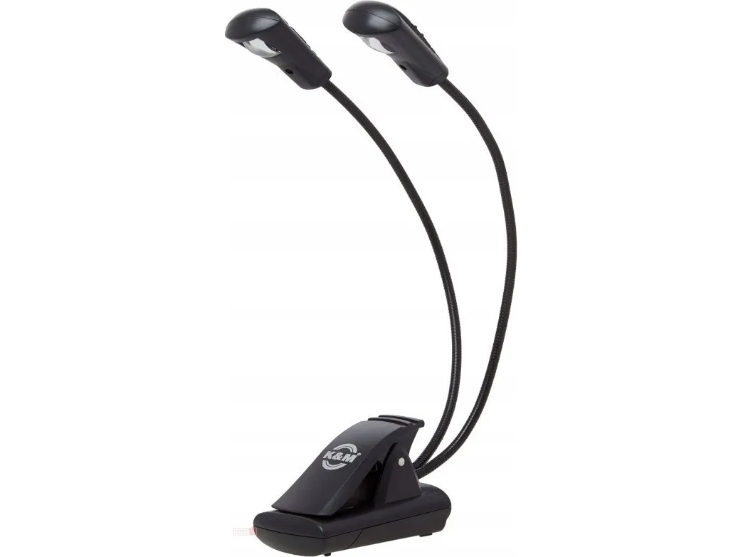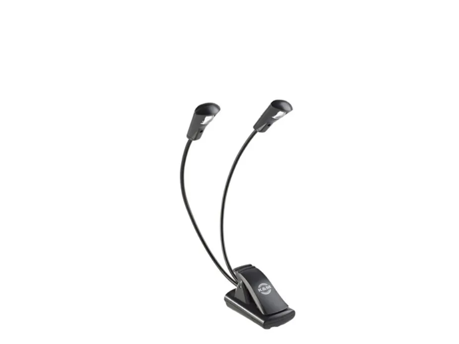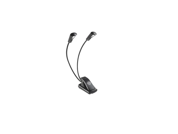 Compact and versatile dual-headed light with 2 flexible goosenecks and with one durable LED on each head. The 2 LEDs can be switched on individually and are rated for 100,000 hours. The practical and extra-wide clip (up to 25 mm) attaches to music desks, table tops etc. It can also be used as a standing light. The goosenecks are easy and compact to fold. Includes 3 batteries (1.5 V AAA) with a battery life of up to 20 hours.