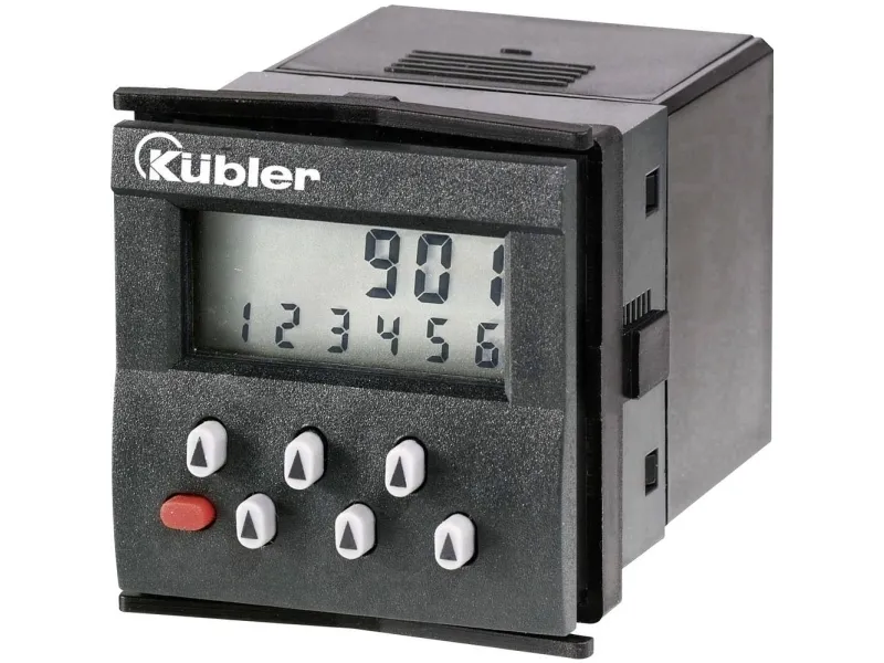 Kübler 901 LCD-forvalgstæller, adderende eller subtraherende (batteri) Den type 901 er en batteridrevet nemmere impuls- og tid forvalgstæller med tæller- og reset-indgang til 12…250 V AC/DC eller med NPN-indgang. Via den 6-cifrede, 2-linjers LCD-skærmen, og den indstillede værdi, relæ tilstand og aktive tid måling.