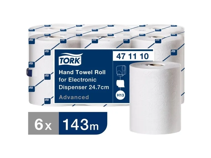 Den elektroniske dispenser til Tork håndklædeark på rulle har en én-ad-gangen dispenserfunktion, der reducerer forbruget og forbedrer hygiejnen. Advanced rullerne har en høj kapacitet, så der altid er papir til rådighed. De er ideelle til travle toiletter i f.eks. skoler og lufthavne.
