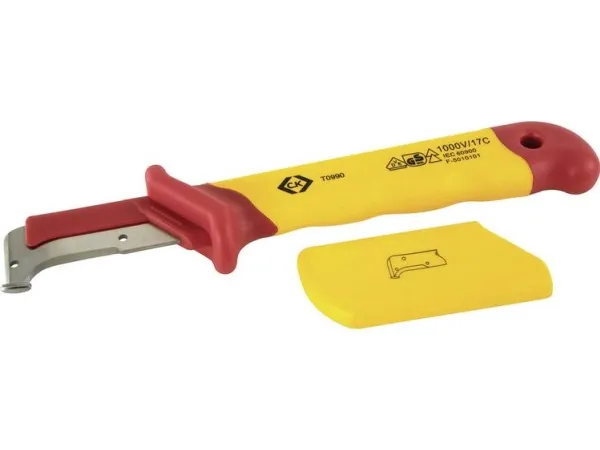 VDE kabelkniv Special-kniv til klipsene tråde af ydre kappen, uden at beskadige de indvendige ledere · Med krogklinge · 2-sidet slebet klinge skærer både ved at skubbe og trække · Komfortabelt tokomponenthåndtag · VDE-certificeret, testet enkeltvis ved 10 000 volt / EN60900 · Rustfri stålklinge, hærdet og anløbet · Leveres med beskyttelseskappe til sikker opbevaring · Samlet længde: 205 mm