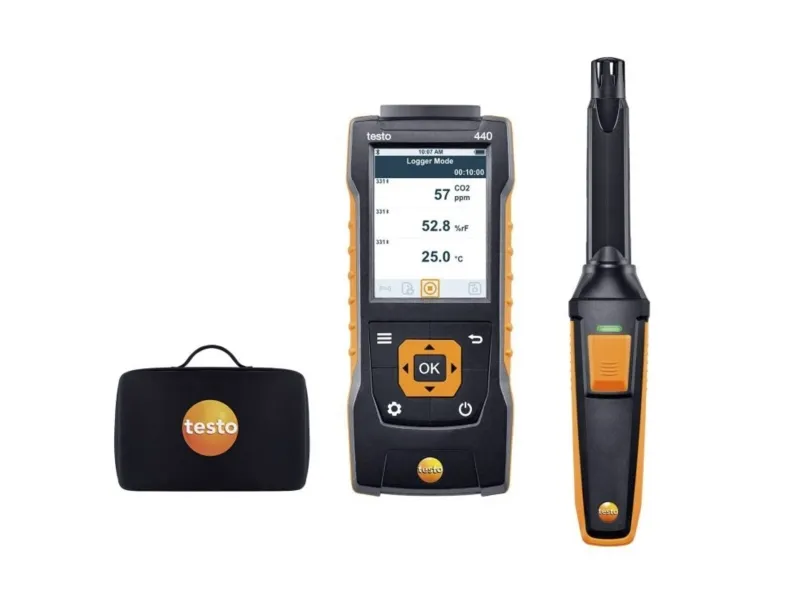 Testo 440 CO2-sæt med Bluetooth® Sæt til måling af CO2-koncentration, luftfugtighed og lufttemperatur og til vurdering af indeklima i kontorer, produktionslokaler eller på lageret. Testo 440 sæt indeholder et klima-måleapparat testo 440 samt CO₂-sonde med Bluetooth inkl. Temperatur- og fugtigheds-sensor. Til sættet medfølger et passende kombi-kuffert!