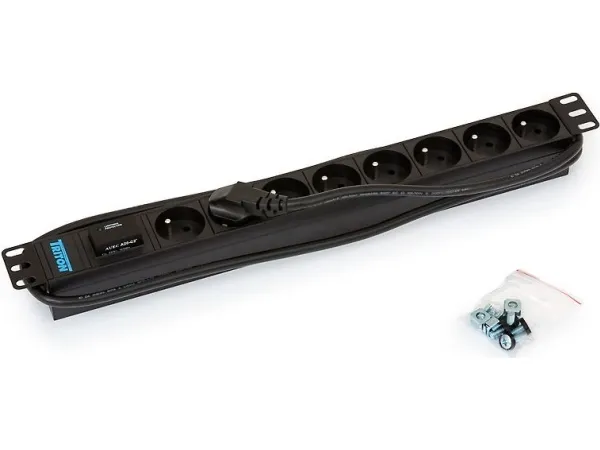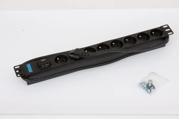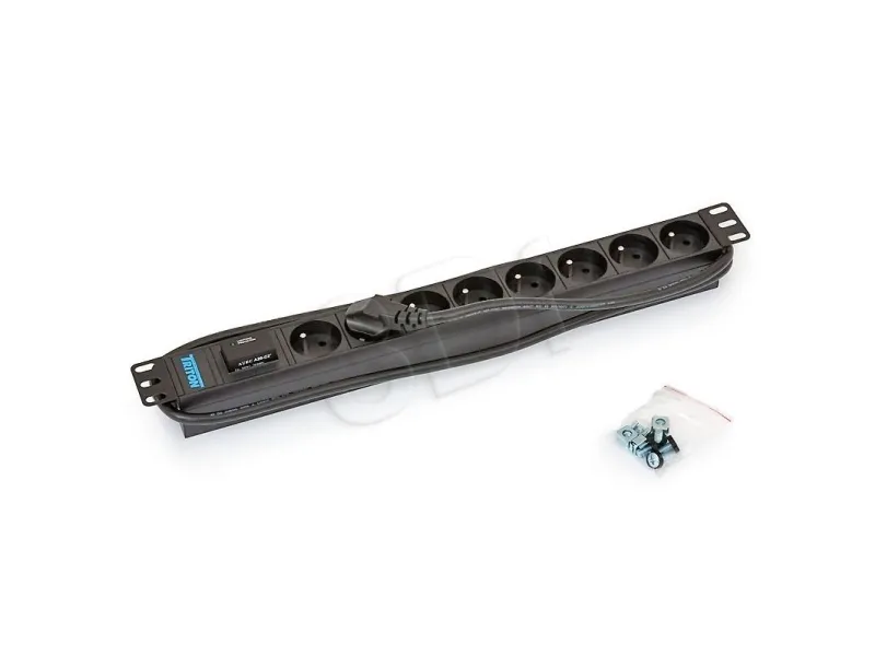 19'' distribution panel 1U, 8 sockets CSN standard, max. 16A, cable 3 x 1,5 mm x 2 m long, DIN49441 16A plug, Varistor surge protection, RAL 9005.